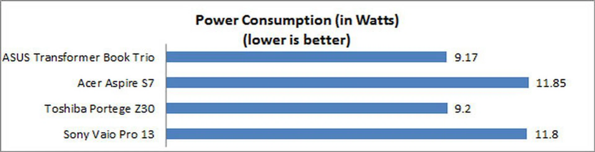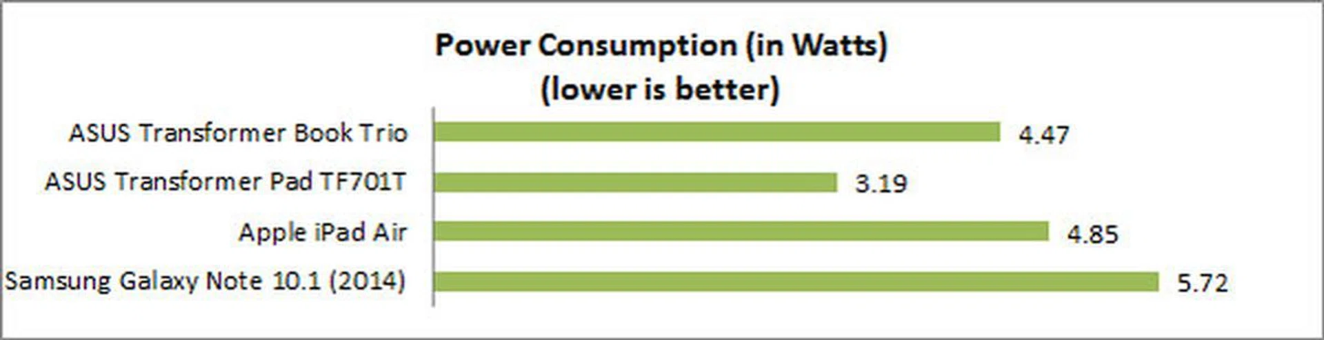 Oddly, the Transformer Book's Trio tablet had rather poor batter life. We can't blame the Intel processor as the following power consumption chart clearly portrays that its one of the better ranked ones. In fact, power efficiency is good considering the large screen size. Lenovo's less accomplished Yoga Tablet 10 (we've linked the Yoga Tablet 8 review but it has the necessary comparison figures), although cheap, it has an even higher power consumption than the 11.6-inch Trio Android tablet. Clearly the battery capacity packed within the Trio isn't adequate for the tablet to truly match up to stand-alone tablet-only products.