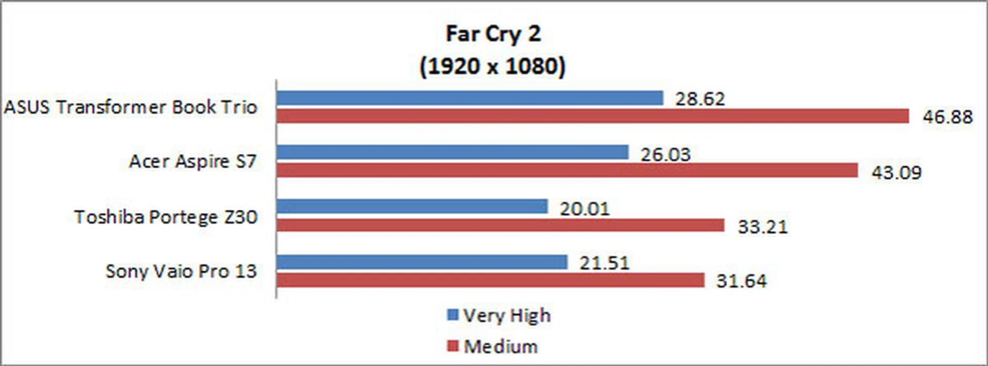 In the old, but demanding Far Cry 2 benchmark, the scores from the ASUS notebook were among the best by a fairly large margin, and is better than the next best Acer machine by about 10%. So while the Trio isn't built for gaming purposes, it can get by with older games perfectly fine as seen here. Apart from this, the other takeaway from the above tests is that the Trio is able to keep up with premium Ultrabooks in terms of general day-to-day use perfectly fine without an SSD drive.