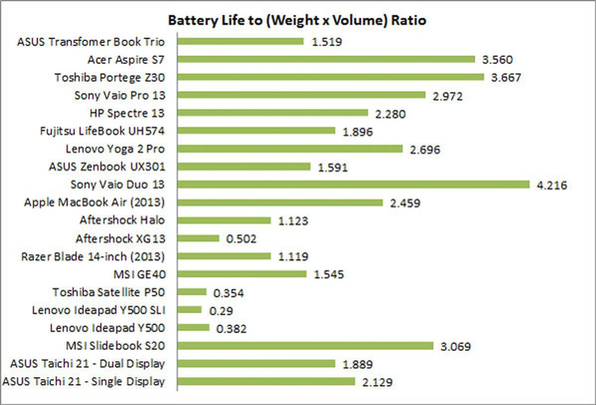 As far as Ultrabook’s go, this number is pretty average. The machine that performs the best in this area is the Toshiba Portege Z30. It managed to cross the five hour mark by a large margin, and is great for users who need their notebooks to have long battery lives.