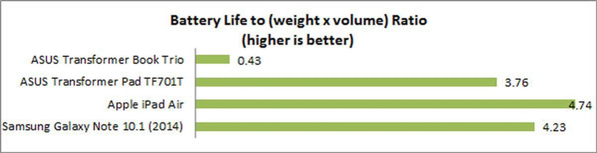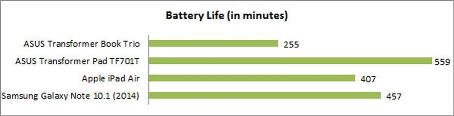 The Trio is only equipped with a 19WH battery, much less than the 30 to 33WH battery charge of most 10-inch tablets. Consider the Trio's larger screen and you can see that it's woefully inadequate. Only the Sony Xperia Z tablet ranked as low in battery life, but it was designed to be the slimmest tablet in the market with an extremely light 495g weight. The Trio's tablet is 700g.