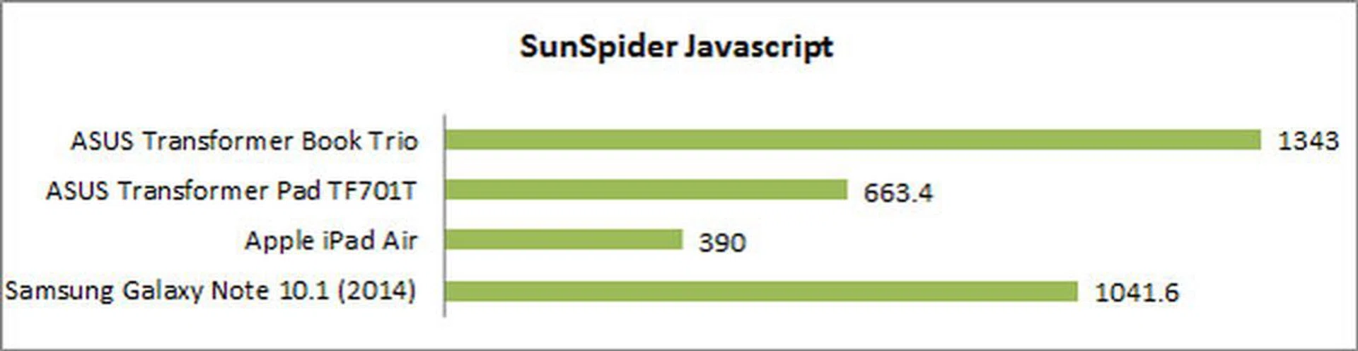 The closest and most telling of them is the SunSpider JS test that's closest to real world use where it measures the browsing performance of a device. It not only takes into consideration the underlying hardware performance, but also assesses how optimized a particular platform is at delivering a high-speed web browsing experience. In his test, Intel's platform was more than 30% slower to complete the tasks as opposed to the next best performing model form Samsung using the Qualcomm Snapdragon 800 processor. Then there's the NVIDIA Tegra 4 on the ASUS Transformer Pad TF701T which is twice as fast as the tablet in Transformer Book Trio.