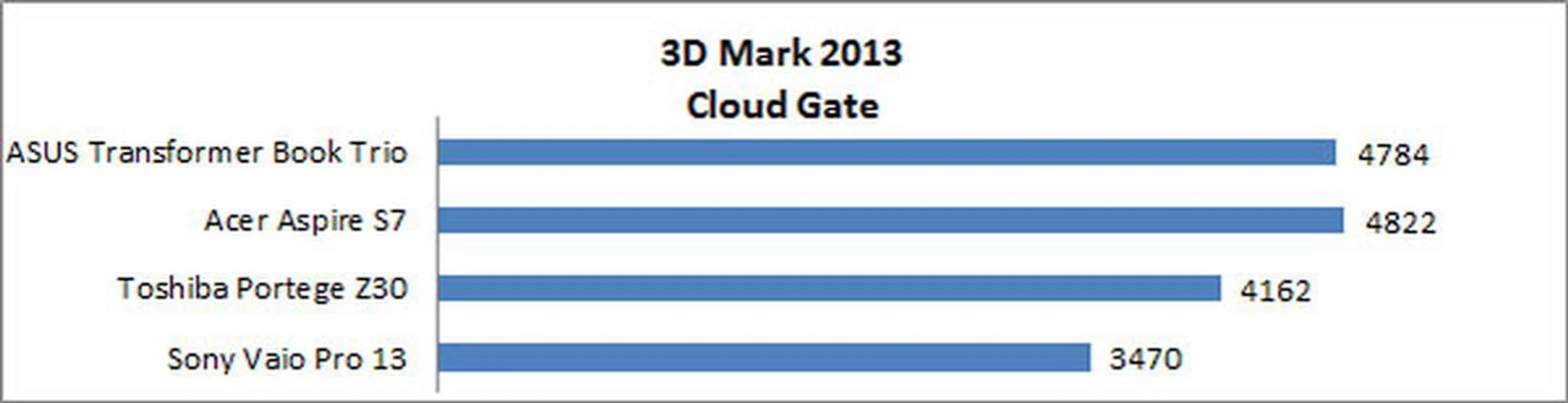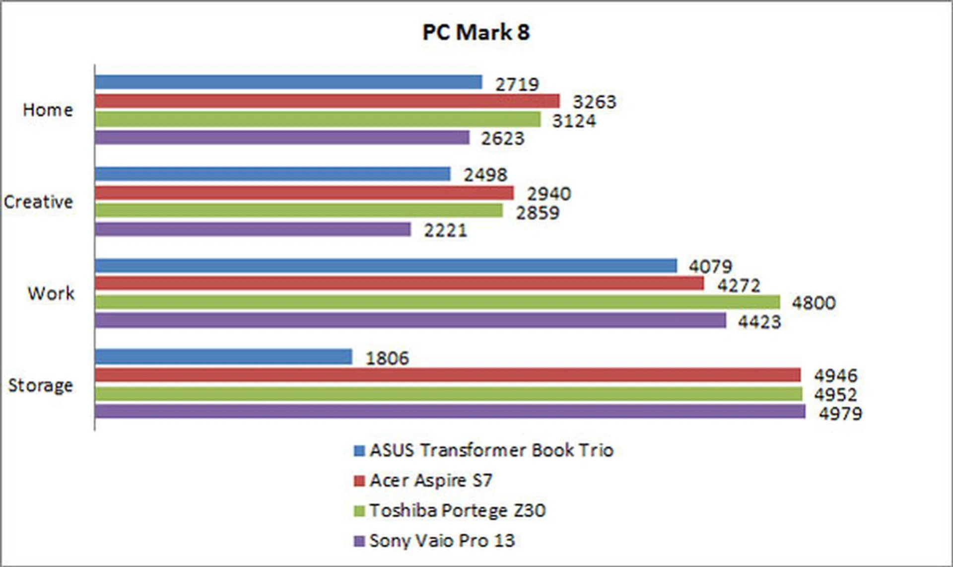 The ASUS Transformer Book Trio has the same Intel Core i7 processor as the other Ultrabooks, which means it also has the same 1.1GHz Intel HD Graphics 4400 onboard GPU. On paper, their scores are expected to be the same, but of course, there are factors like a notebook’ design that can affect the thermals generated by the machine that affects the level of CPU and graphics performance boost available. In the worst case scenario, the CPU would have to throttle back and this would affect performance further.