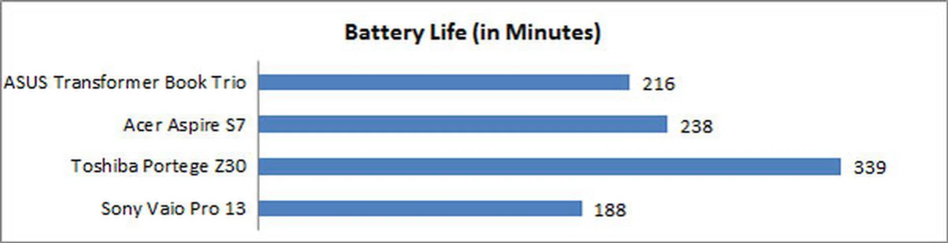 The Trio might be two devices, but for this portion of the test we tested the Ultrabook portion that's built in the keyboard base and it 33WH battery. The Trio only managed to run for about three hours and 36 minutes due to the small battery capacity.