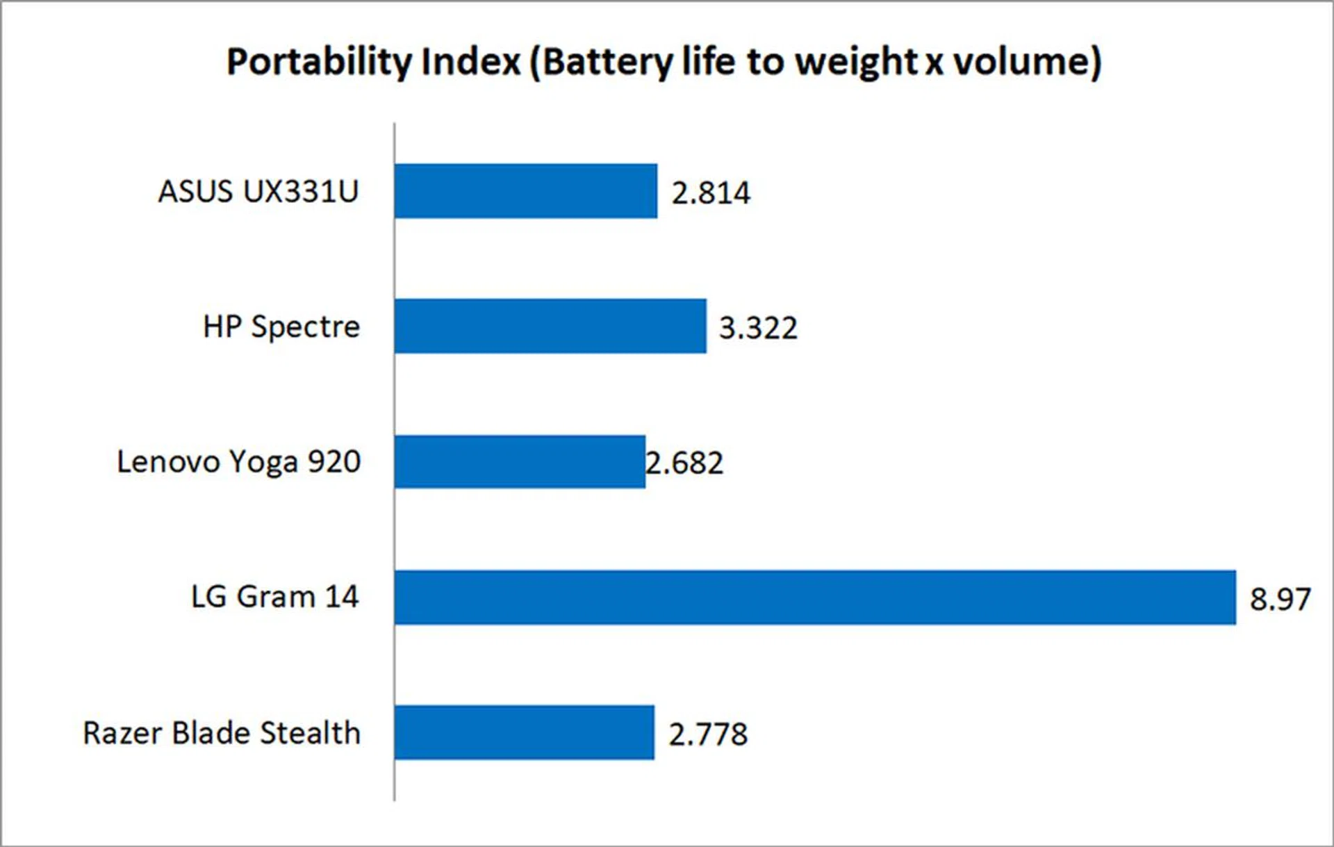 Our portability index takes into account battery life, weight, and volume to provide a measure of how easy a notebook is to carry around relative to other compared systems.