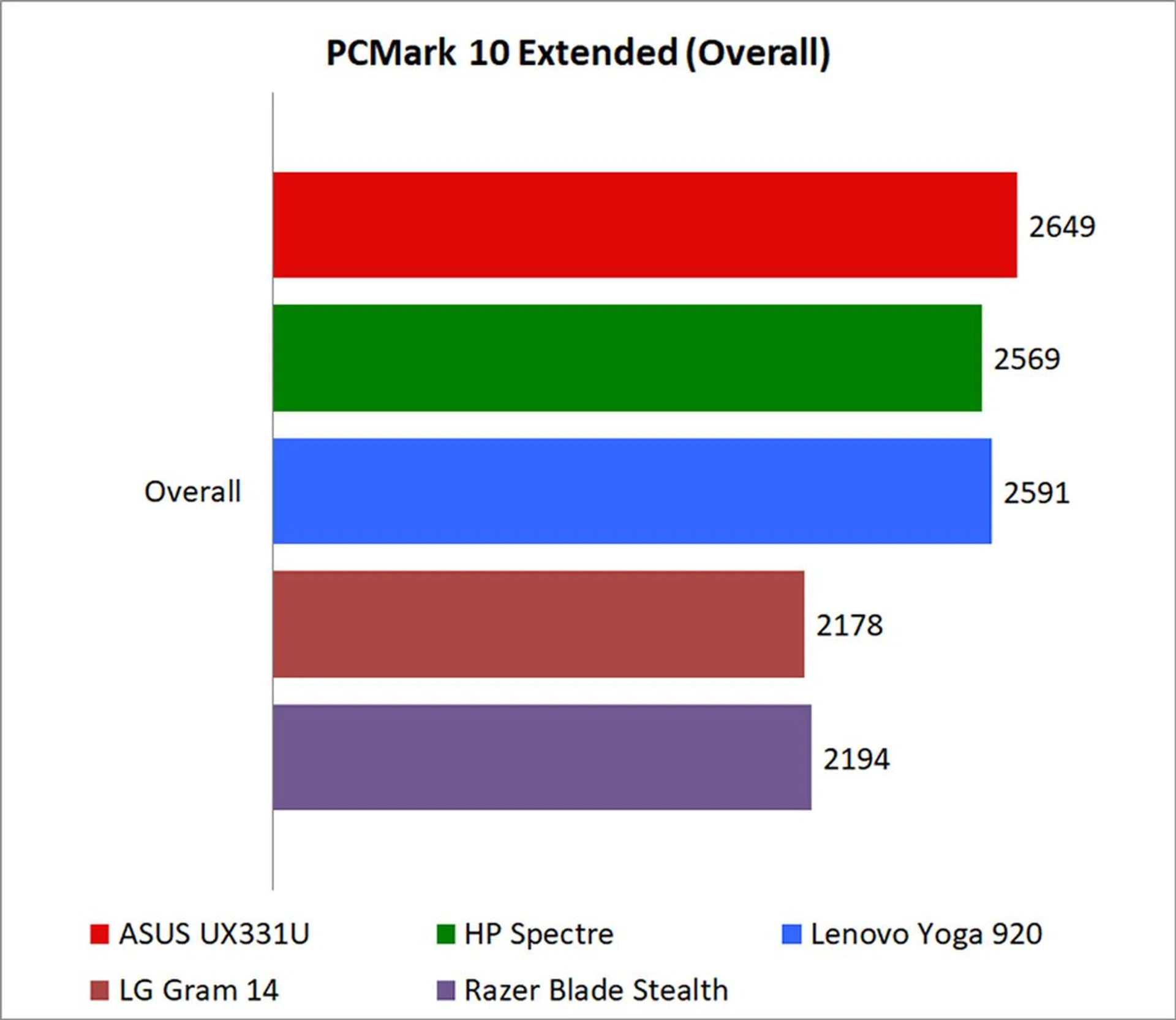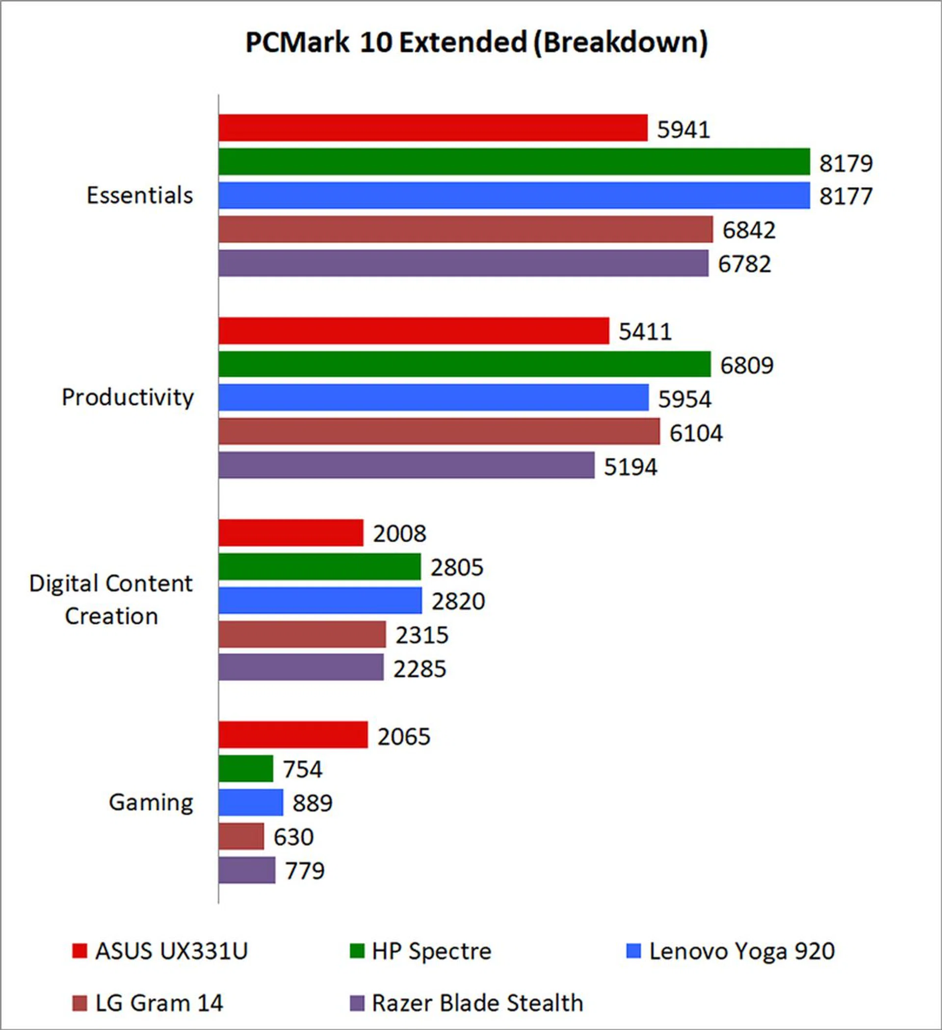That’s disappointing, as it looks like the ZenBook could have taken a much more commanding lead if it had performed up to snuff across the board. What’s particularly damning is the fact that the ZenBook underperformed even compared to the LG Gram 14 and Razer Blade Stealth, both of which were equipped with the older Core i7-7500U processor. In fact, it was around 12 per cent behind the Blade Stealth in the Essentials workload.