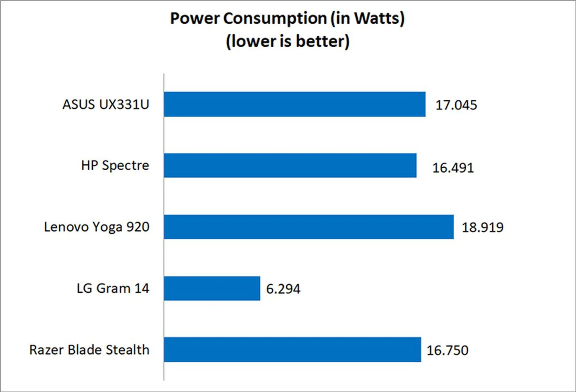 Instead, the power consumption figures for the ZenBook are pretty much in line with the other laptops, with the exception of the LG Gram 14 and its freakishly low power consumption numbers.