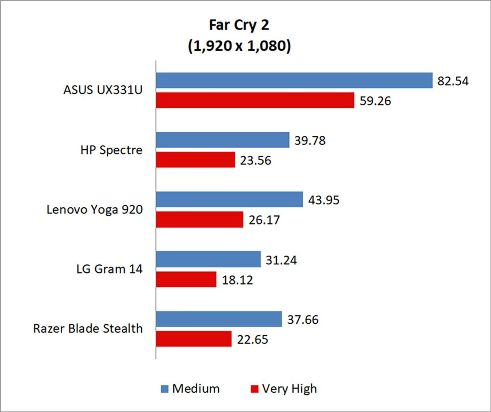 It was a similar story in Far Cry 2, and the ZenBook was around 126 per cent faster than the Lenovo Yoga 920. For older and less demanding e-sports titles at least, the GeForce MX150 looks like it should do okay if you stick to 1080p and low settings.