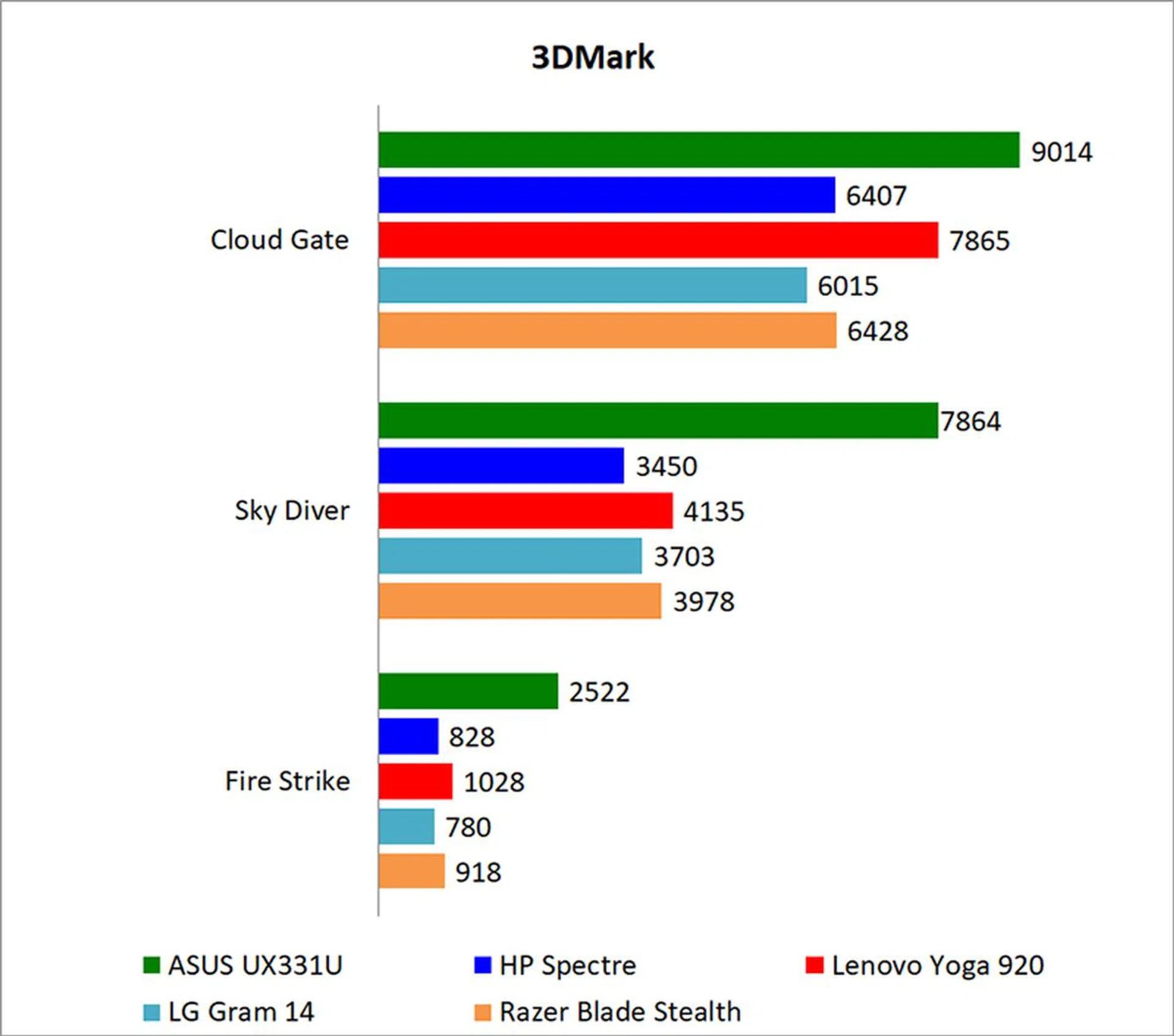 In 3DMark, the ZenBook unsurprisingly powered ahead of its counterparts with integrated graphics. In the Sky Diver test, which was designed for systems with mainstream GPUs or integrated graphics, it was a whopping 90 percent faster than the Lenovo Yoga 920, the next best performer.