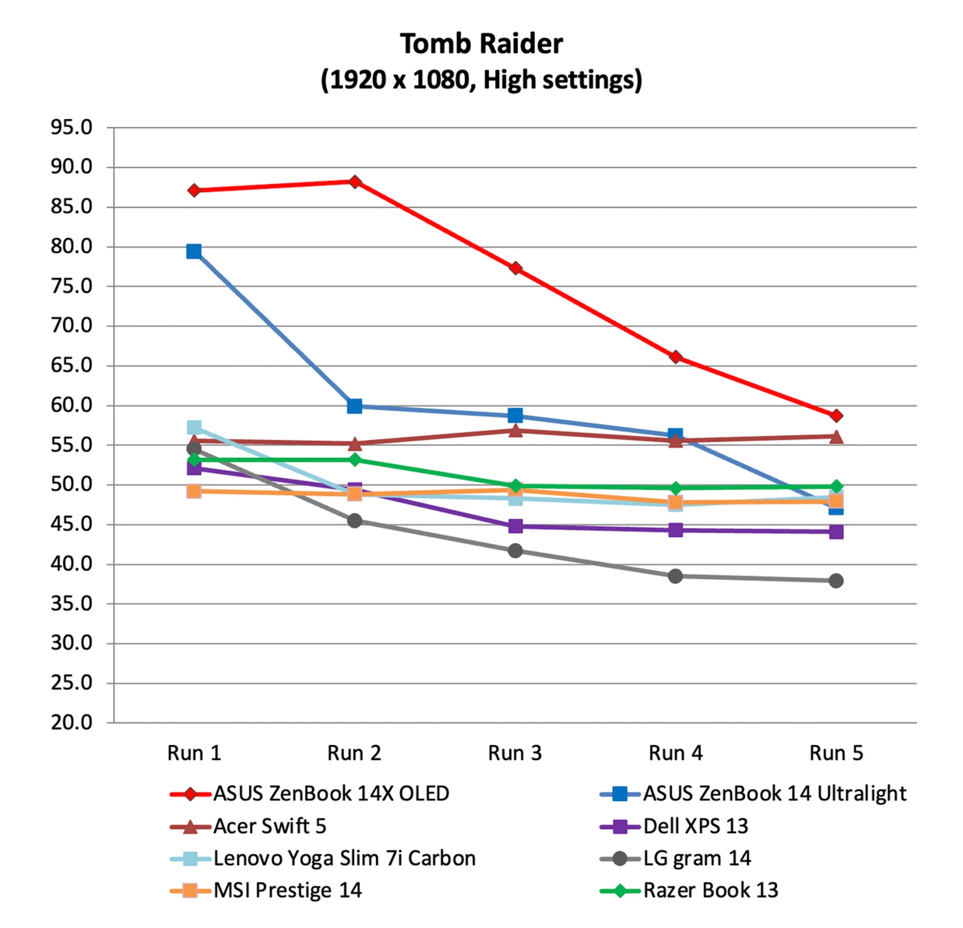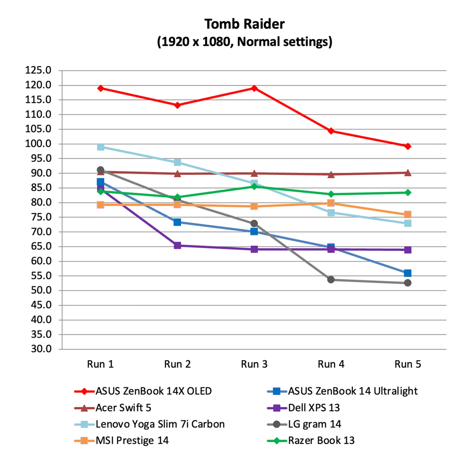 Performance was generally very good. Perhaps because of its IceCool Plus cooling system, the ZenBook 14X OLED confidently outscored the ZenBook 14 Ultralight, which shares the same specifications. It turned out the best scores on most benchmarks including PCMark 10, Cinebench, WebXPRT 3, and Tomb Raider. However, thermal throttling is an issue as evidenced by how frame rates dropped after a couple of runs on Tomb Raider. If it’s any consolation, this is an issue that plagues most ultraportable notebooks. And even at its lowest, the ZenBook 14X OLED was still managed the highest frame rates. Even at its poorest, it recorded close to 60fps on the more intensive High graphics setting.