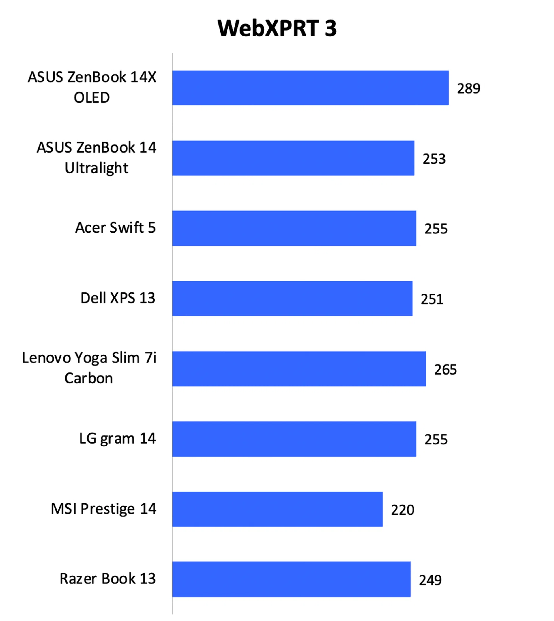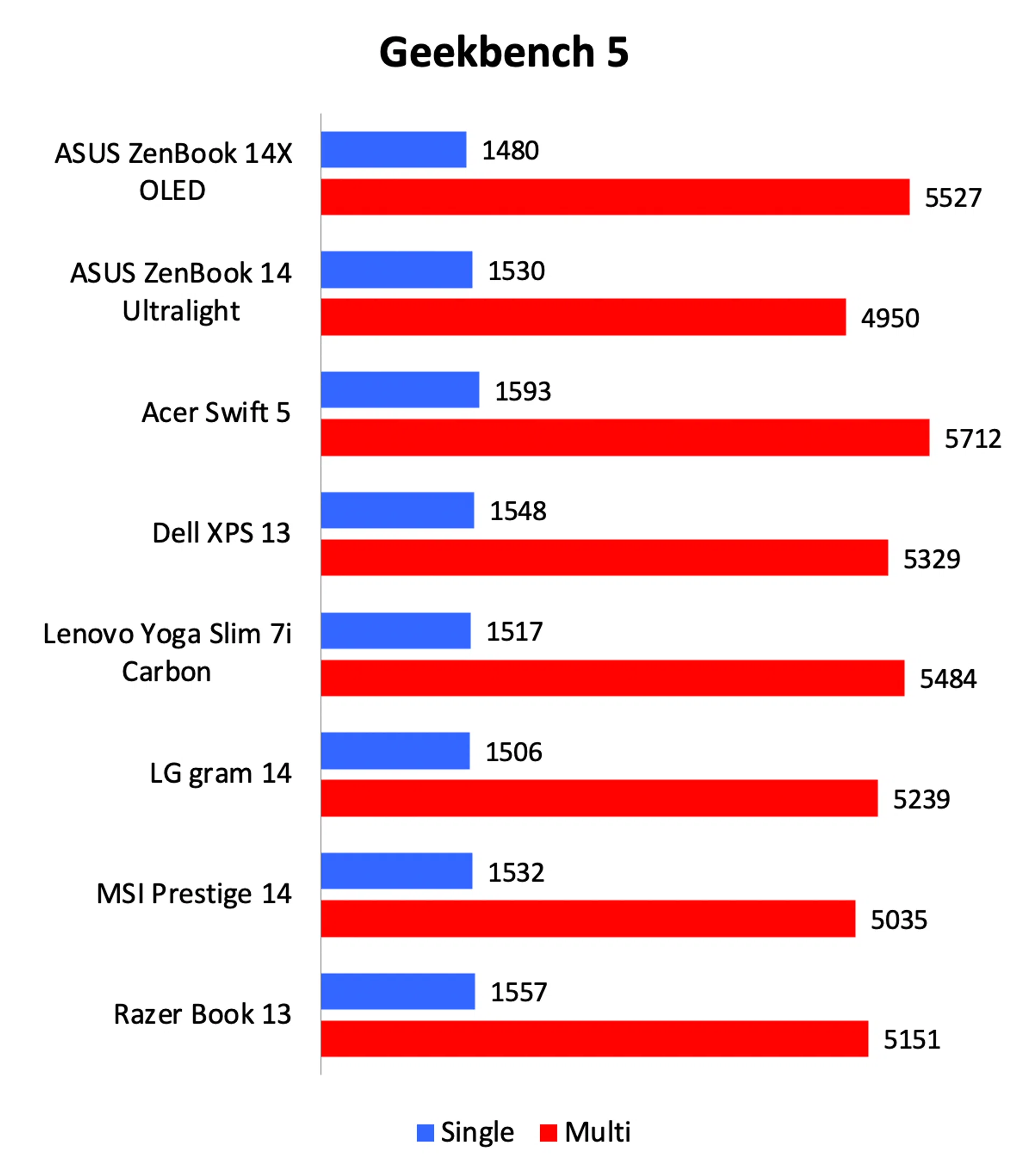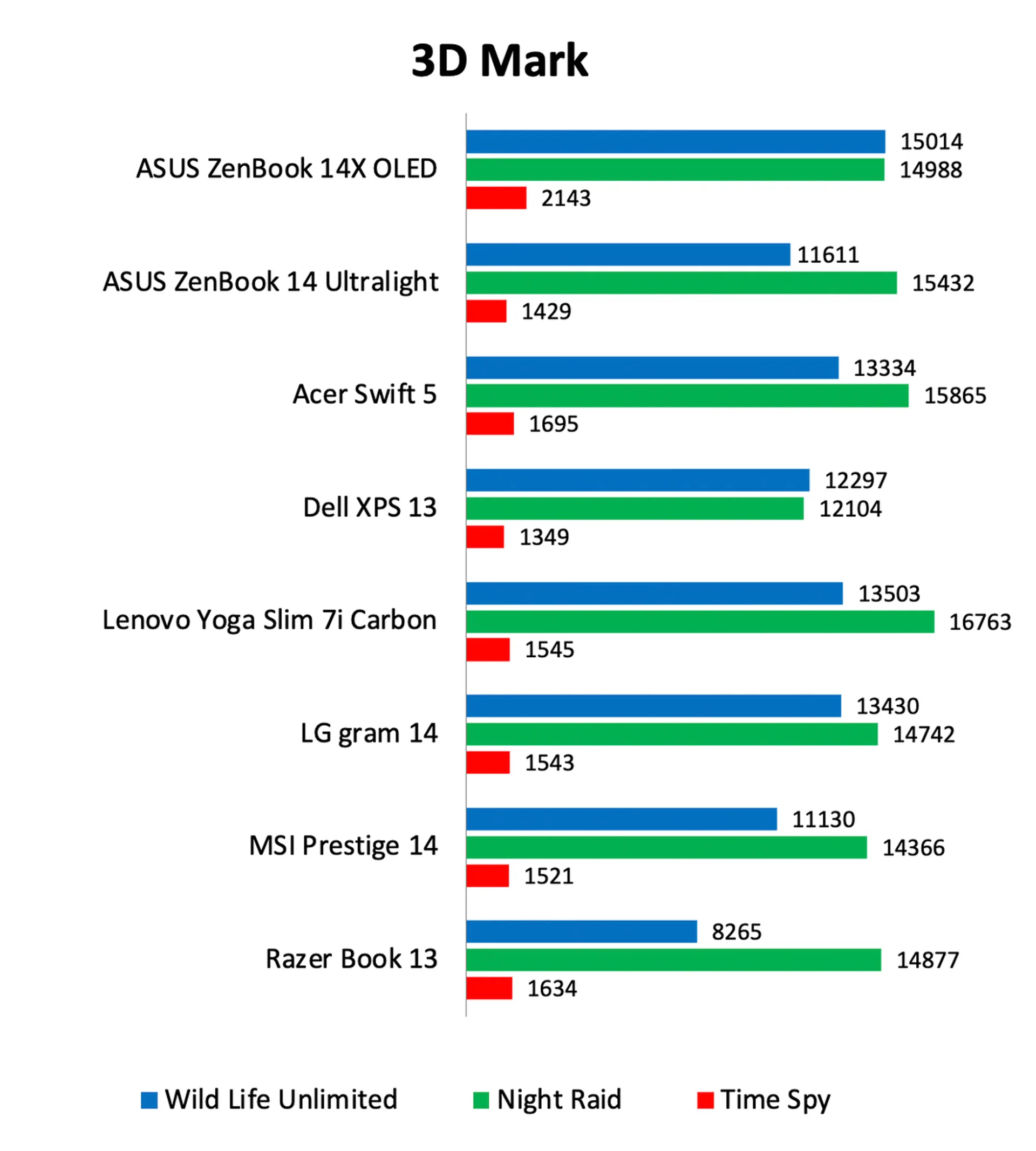 The ASUS ZenBook 14X OLED is powered by the same Core i7 version of Intel's Tiger Lake processor that is found in nearly every other notebook in its class. It also has 16GB of memory and is one of the few notebooks to feature discrete NVIDIA GeForce MX450 graphics. We will be comparing its performance against other comparable ultraportable notebooks like ASUS' own ZenBook 14 Ultralight, the Acer Swift 5, Dell XPS 13, and more.