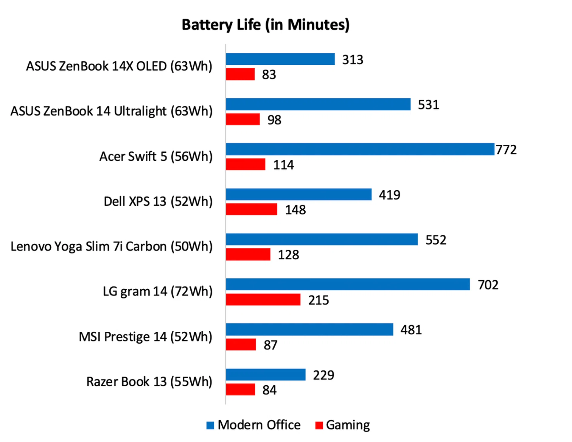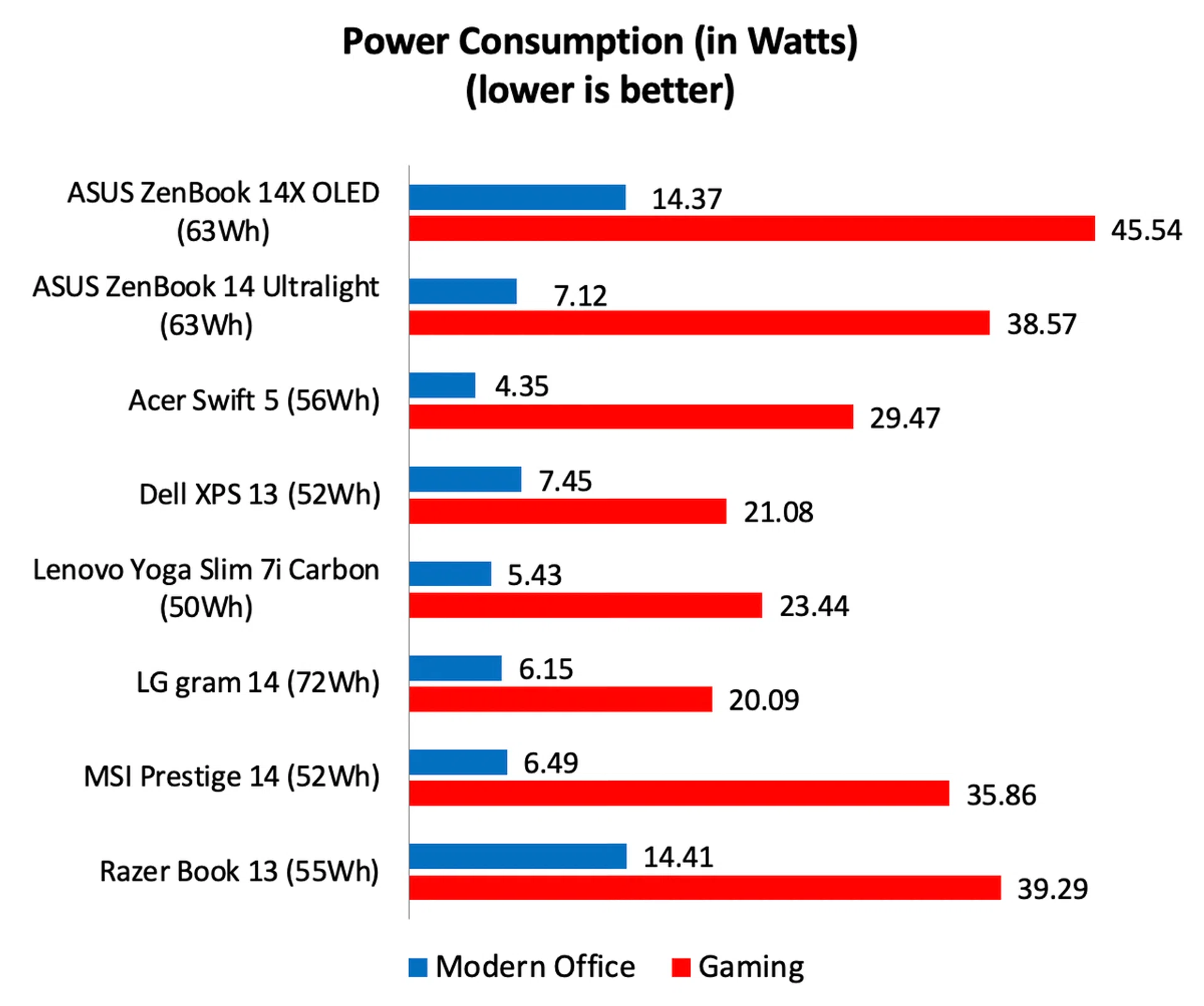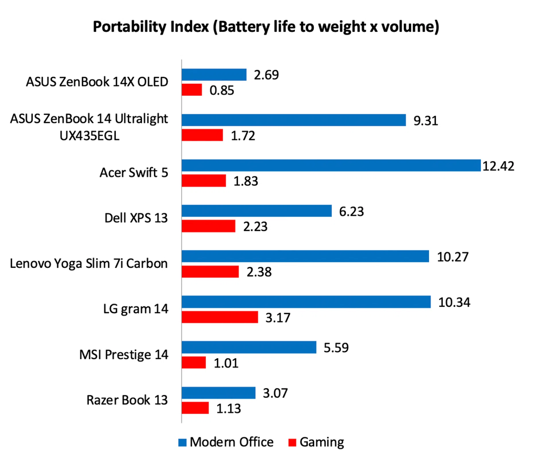 Battery life is arguably the ZenBook 14X OLED’s downfall. Despite having the same battery capacity and similar specifications as the ZenBook 14 Ultralight, it managed just over 5 hours, or 313 minutes to be exact. That’s a whopping 218 minutes or 41% less than the ZenBook 14 Ultralight. I had expected the ScreenPad as well as the higher resolution and brightness of the main display to put a greater strain on the battery but certainly not to this extent. Looking at the power consumption figures, we can see that on the Modern Office workload, it was consuming about double the energy of the ZenBook 14 Ultralight. Consequently, the ZenBook 14X OLED recorded the lowest Portability Index scores among notebooks of its class.
