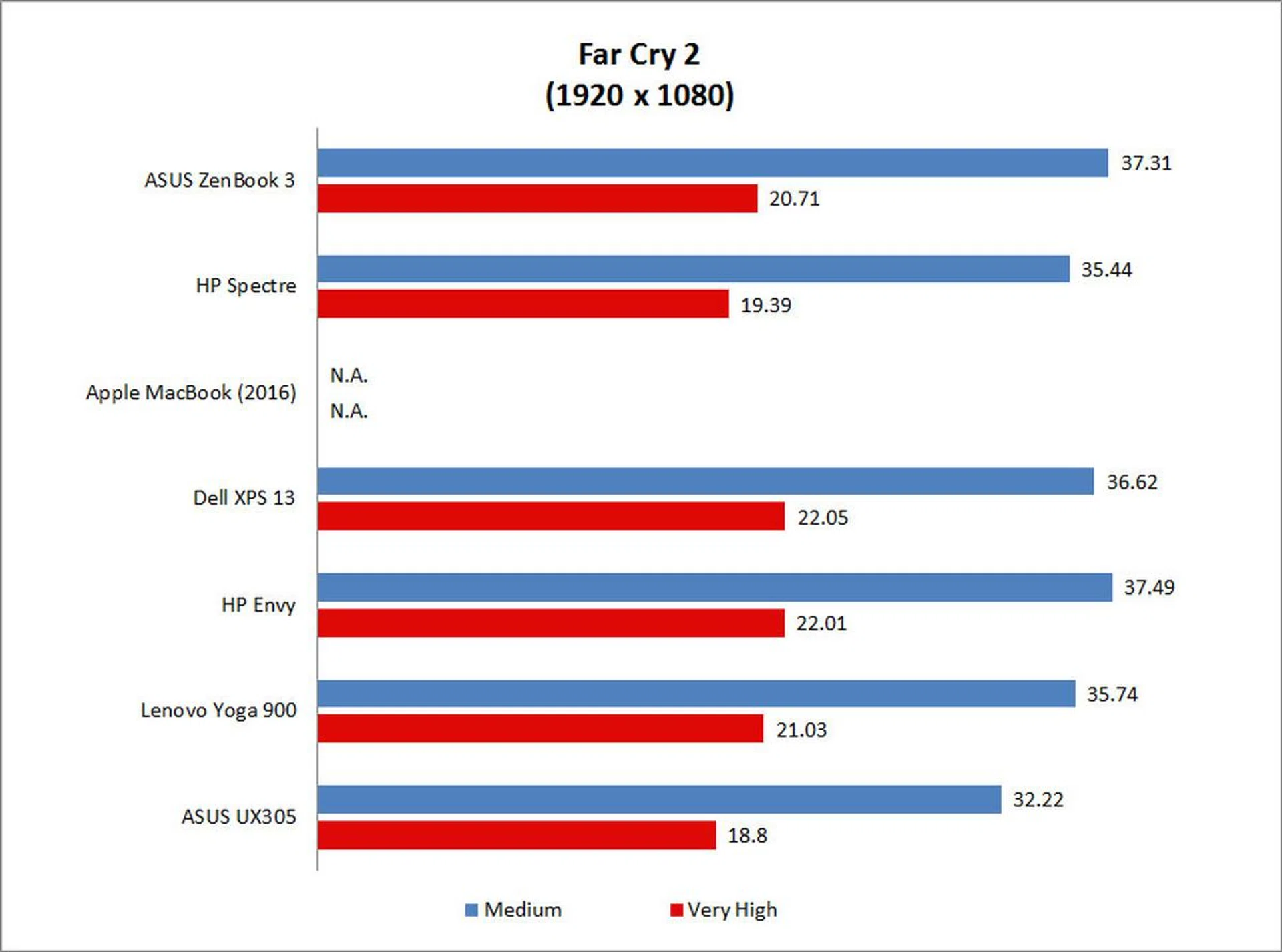 Performance was a mixed bag on Far Cry 2. The ZenBook 3 actually fell behind some of the other Skylake notebooks, although it once again quite handily outstripped the older ASUS UX305.
