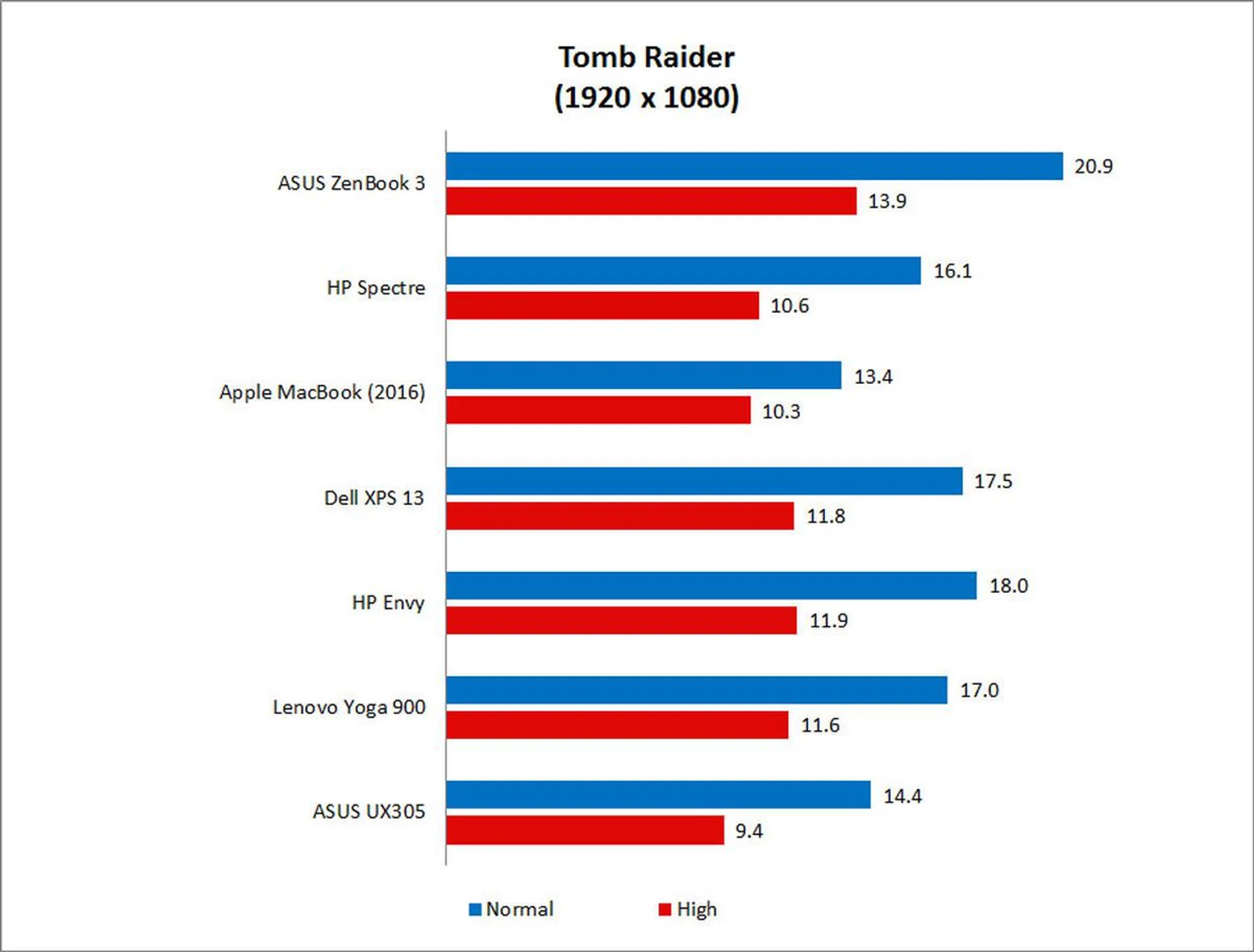 The results in Tomb Raider reflected what we observed in 3DMark. The ASUS ZenBook 3 took the lead once again, and it was up to 23 per cent faster on High settings than comparable Skylake notebooks at best. Again, this varied from notebook to notebook, with the HP Envy coming closest to inching out the ZenBook 3.