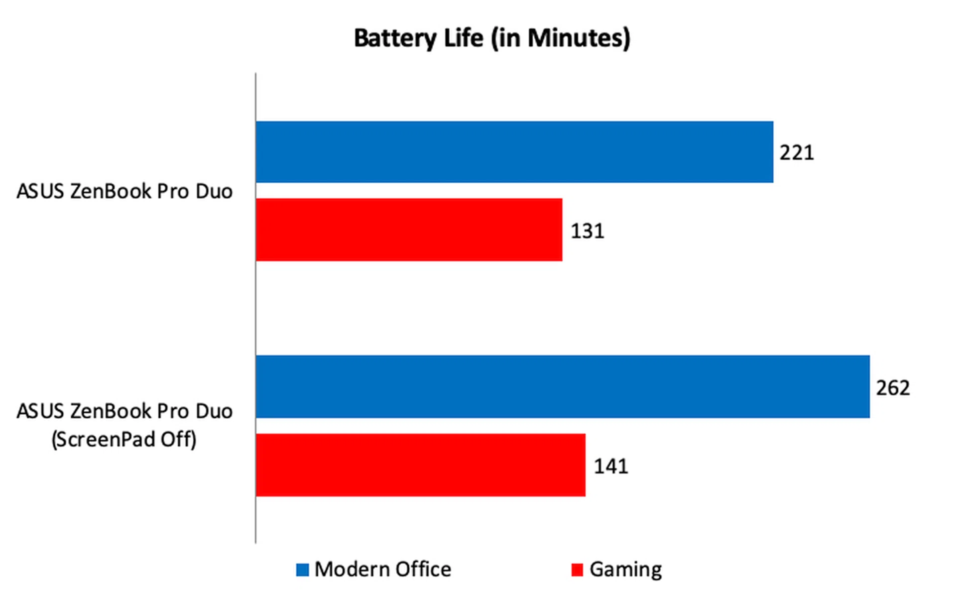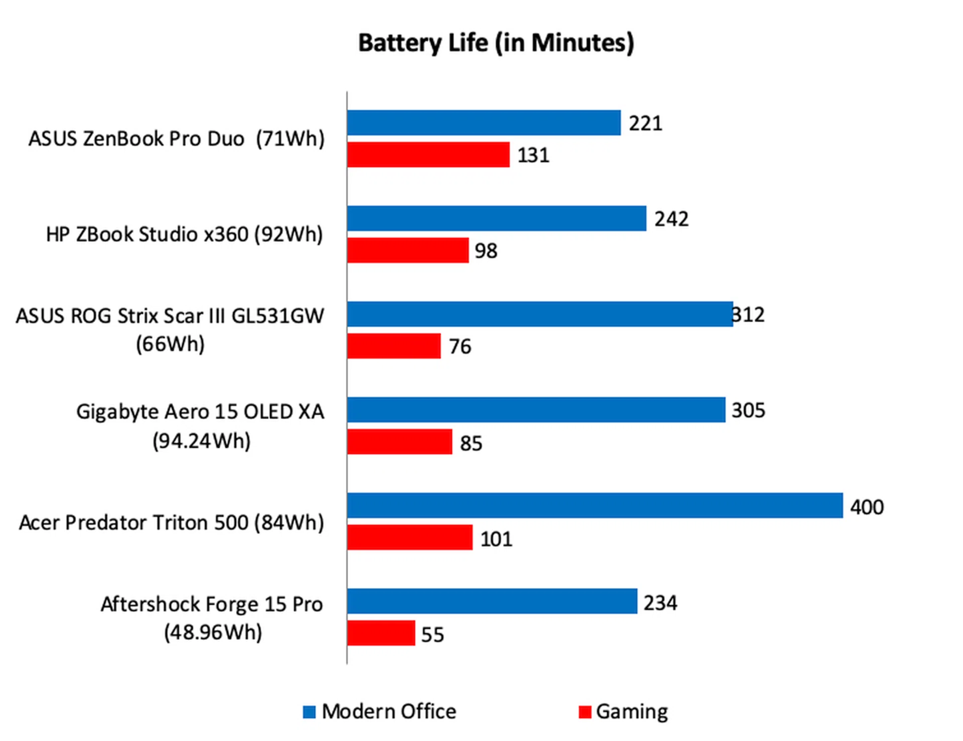 With its two displays and power-hungry Core i9 processor, the ZenBook Pro Duo's battery life was unsurprisingly the shortest at just 221 minutes or 3 hours and 41 minutes. Surprisingly, in the Gaming benchmark, it actually lasted the longest and was the only notebook to get over 2 hours worth. This is likely due to a combination of its less power-hungry GPU — GeForce RTX 2060 as comapred to the GeForce RTX 2070 of most of the other gaming notebooks — and sizable battery. The Aftershock Forge 15 Pro also has a GeForce RTX 2060 GPU but its battery capacity is just over 48Wh — roughly 67% of the ZenBook Pro Duo's.