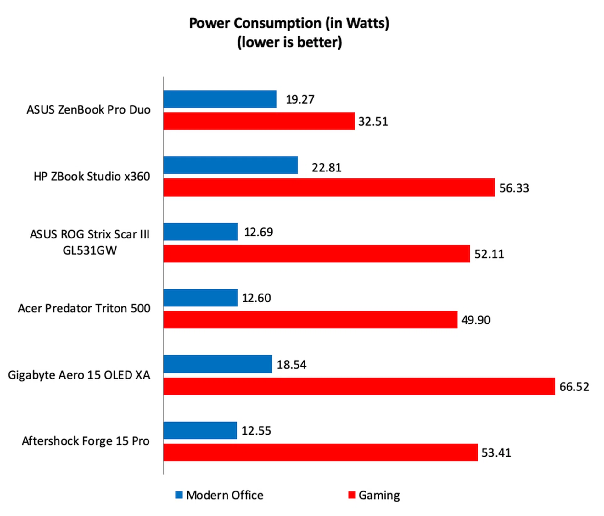 Looking at the power consumption figures, we can see that the ZenBook Pro Duo's weren't the highest. In the Modern Office benchmark, it was bested by the HP ZBook Studio x360 which lasted longer in the battery life test mostly because of its massive 92Wh battery. Also, it's gaming power consumption figure of just over 32W was the lowest by a great deal — at least 35%.