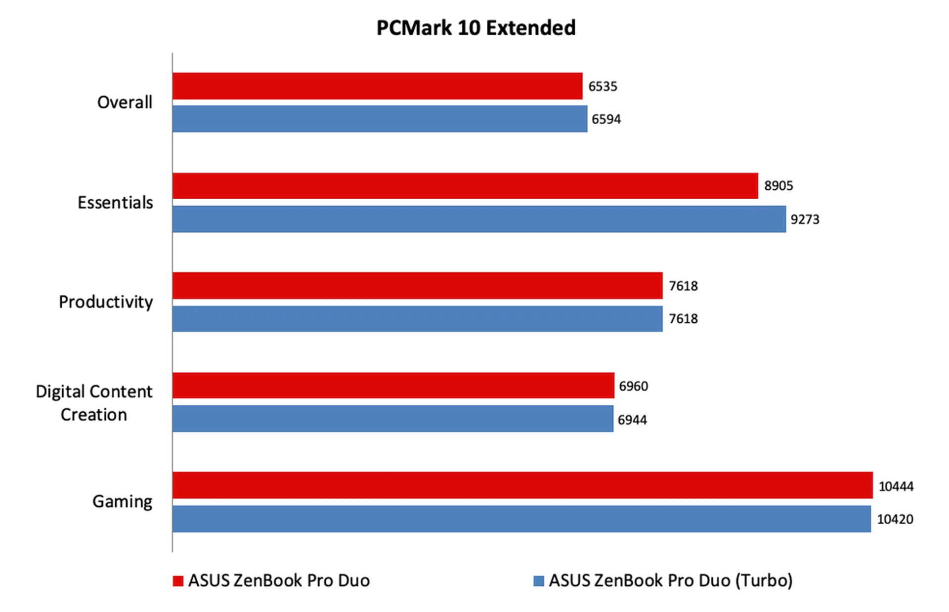 Again, it does, but it seems like it works best in CPU-intensive workloads. As you can see from the charts below, GPU-intensive benchmarks like 3DMark and games saw little to no improvement. However, there was a vast improvement in Cinebench, with multi-core scores jumping by nearly 20%. And if you look at the breakdown of PCMark 10 scores, you can see that the ZenBook Pro Duo performed noticeably better on the Essential workloads ― which tests everyday performance including app startup times ― in Turbo mode.