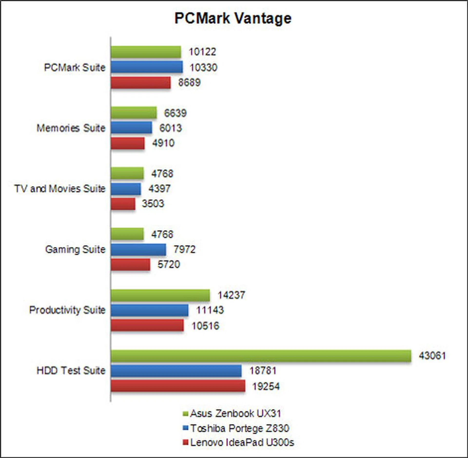 Specs-wise, the Zenbook UX31 is decidedly pretty average. However if you’d look at its phenomenal scores under the HDD test suite, it might seem safe to conclude that the UX31 comes with a very high performance SSD. However when it comes to regular multimedia tasks, it doesn’t represent much improvement over the SSDs that the other two machines use, hence the similar overall scores.