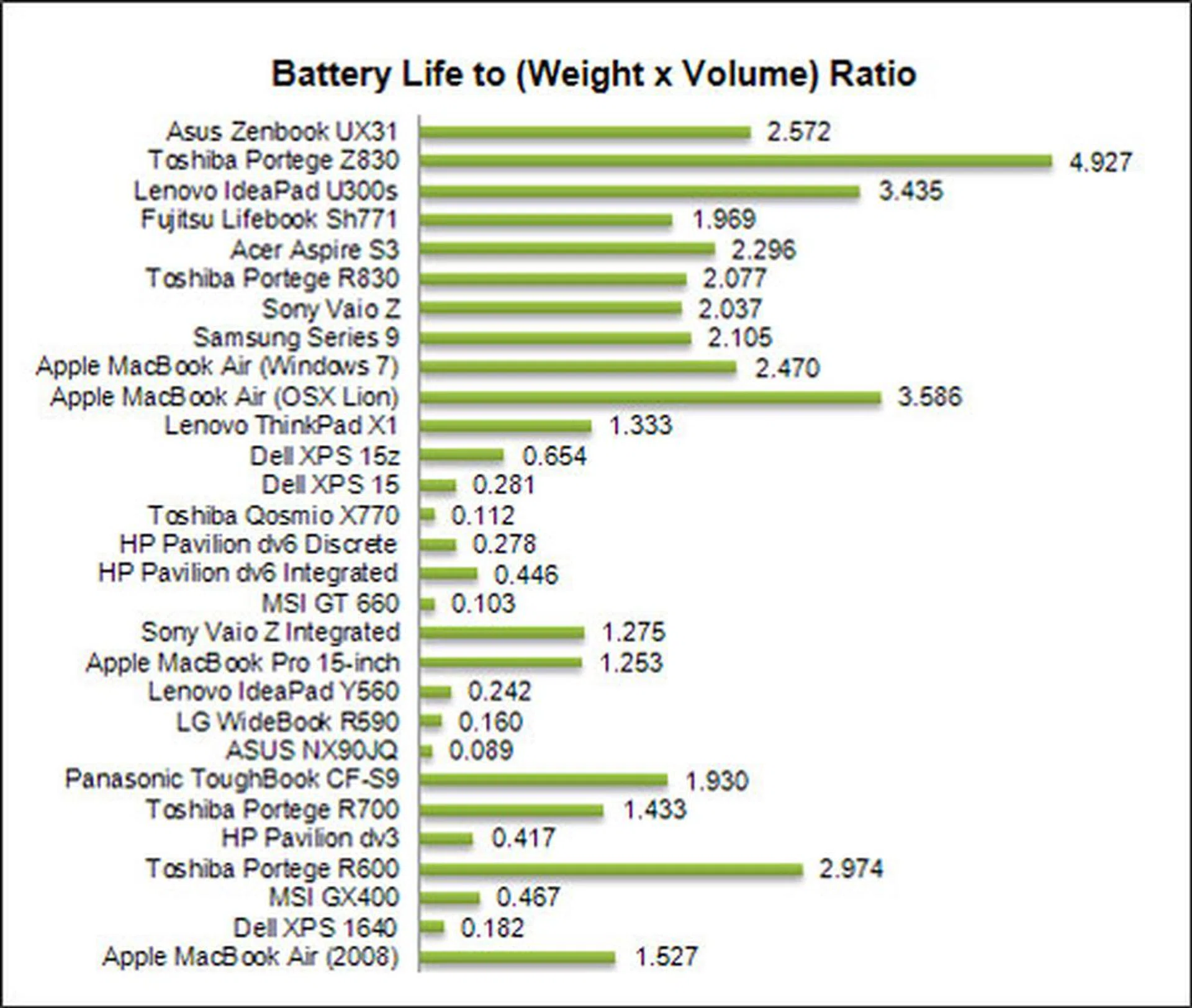 As you can see from the chart, portability isn’t the Zenbook’s strongest feature. We'd even go so far to say that it’s half as portable as the Z830, which has set recent portability records with its very impressive battery life. That's not to say however, that the ASUS Zenbook UX31 isn’t worth of your time and money. As far as notebooks go, a score like this is still one if the better scores in the charts, especially when compared to non-Ultrabooks types. It's just that the Zenbook doesn't shine if you truly need an outstanding notebook in terms of portability. If you like its build, and feel, the UX31 is still a good personal choice for you.