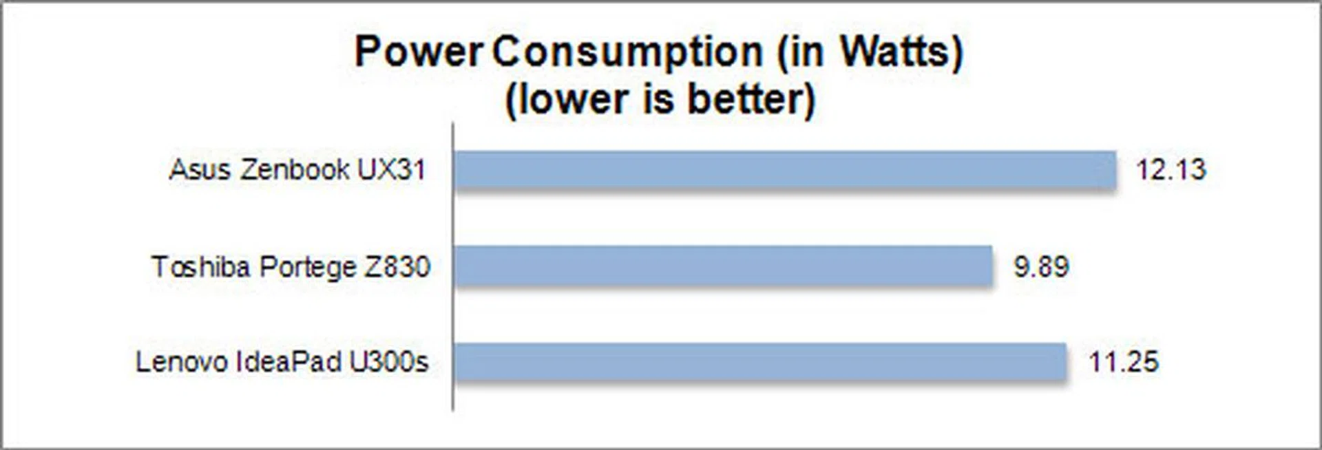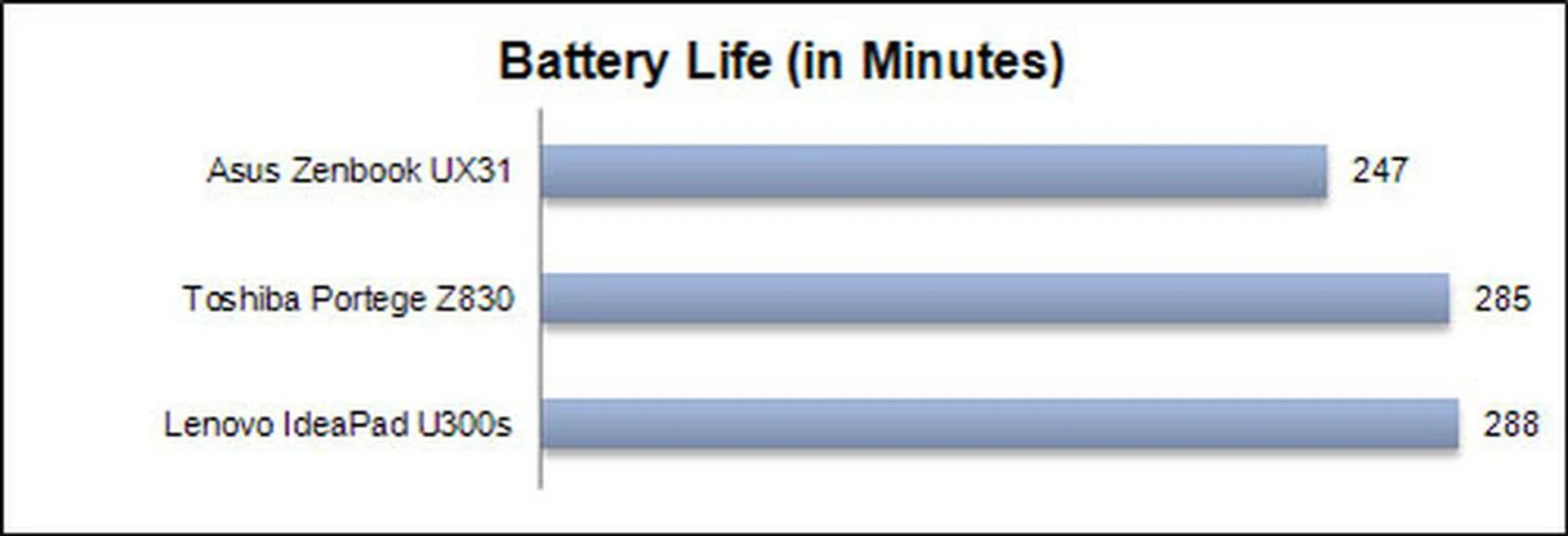 One of the reasons why the UX31 doesn't last as long as the other Ultrabooks is because it draws more power than the other two. However you've also got to consider the fact that it actually needs more juice to power up its higher resolution screen, which naturally needs more power. Though the discrepancy in needing more power for a higher resolution display isn't usually as pronounced.
