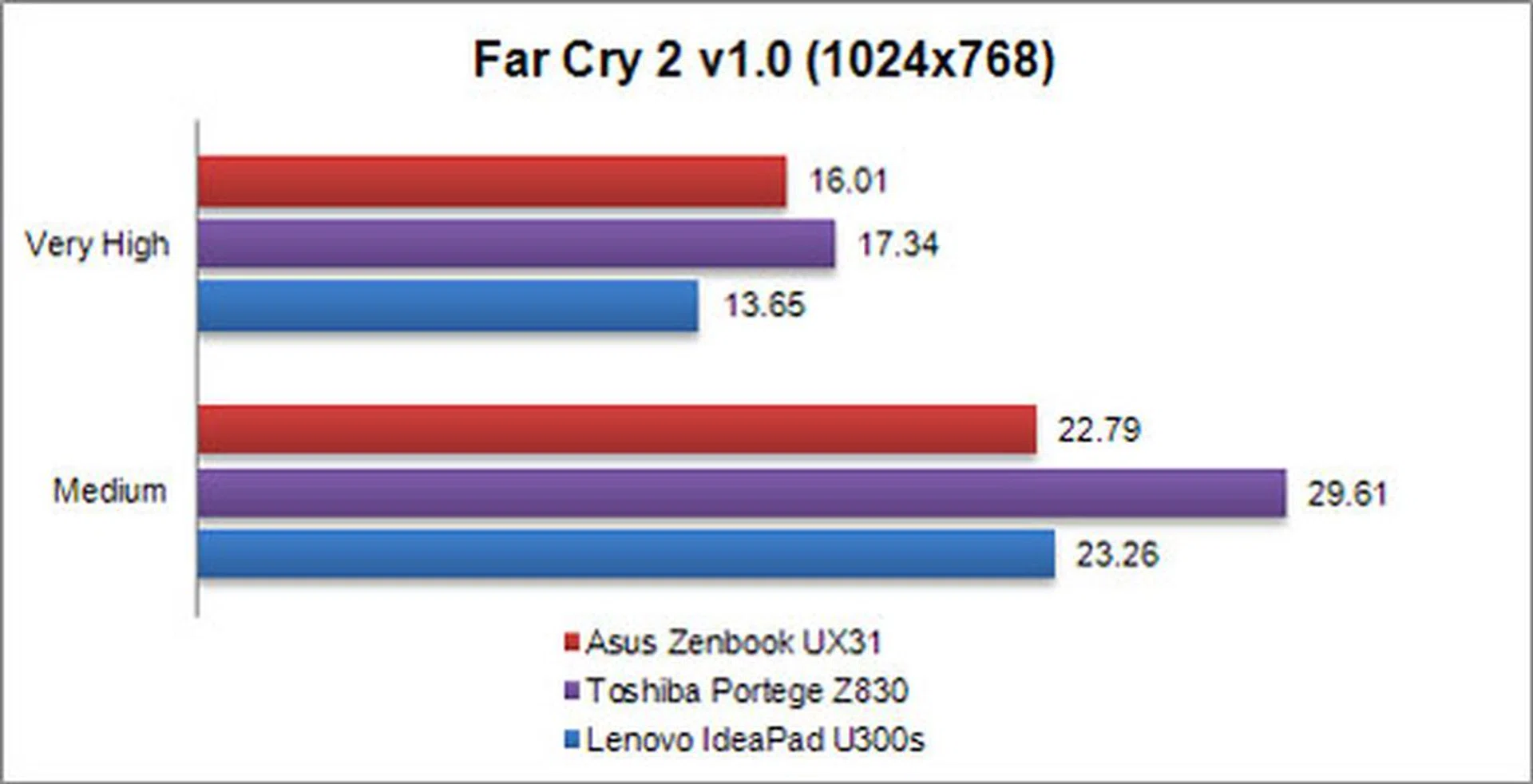 The best test of a machine’s capability is to run a graphics intensive game benchmark. Here, the ASUS UX31 may not be the best performer, but it did manage to keep up as expected. That said, if you’re into graphics intensive gaming, it would be best to look away from the ASUS UX31 or any other Ultrabook as they won’t be able to meet your expectations such of churning out even 30fps for medium scale of graphics settings. Of course, if what you need is just a machine that allows for casual gaming, web surfing or movies, then the UX31 and the other compared machines would suit just fine.