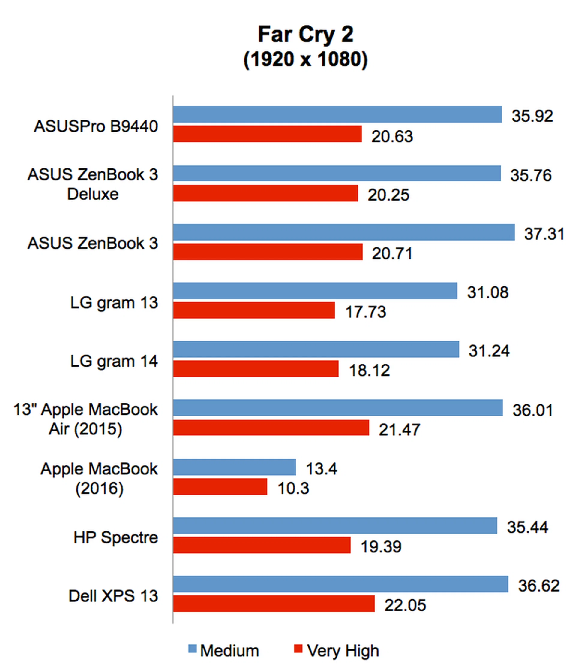 On Far Cry 2, the ASUSPRO B9440 managed identical frame rates to the ASUS ZenBook 3 Deluxe and ZenBook 3. It was also noticeably faster than the LG gram 13 and 14. That said, it wasn’t actually any faster than other notebooks like the Dell XPS 13 and HP Spectre, which are powered by older Intel Skylake processors.