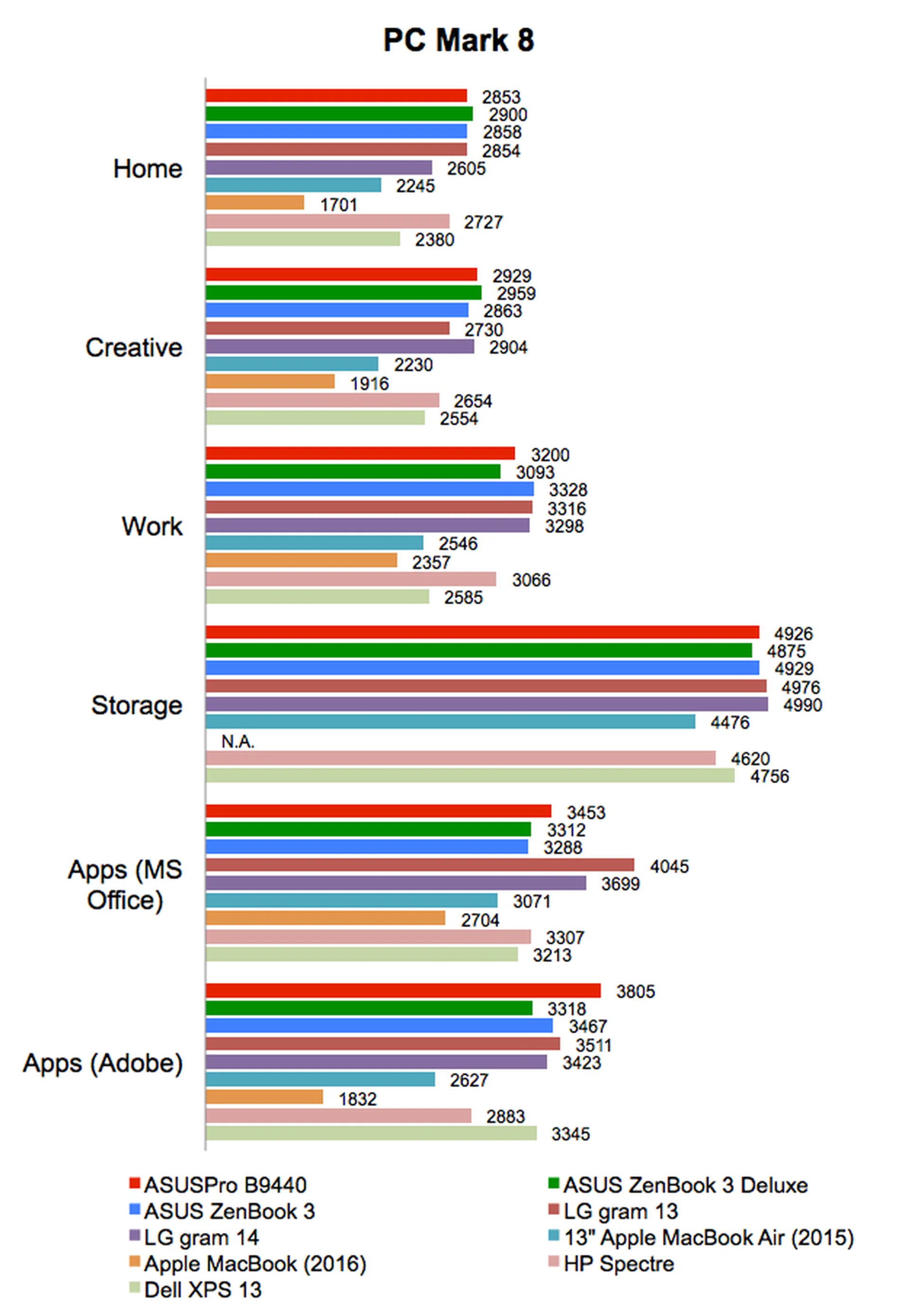 PCMark 8 tests a system’s performance by putting it through different tasks that reflect the workloads of various kinds of users, for instance the casual home user or the working creative professional. Given the nearly identical specifications of the ASUSPRO B9440 and the ASUS ZenBook 3 Deluxe and ZenBook 3, it wasn’t surprising at all to see that all three notebooks managed comparable, if not nearly identical scores on PCMark 8. That said, the B9440 did stand out for its excellent showing on the Adobe workload, where it managed the highest score of 3805 points.
