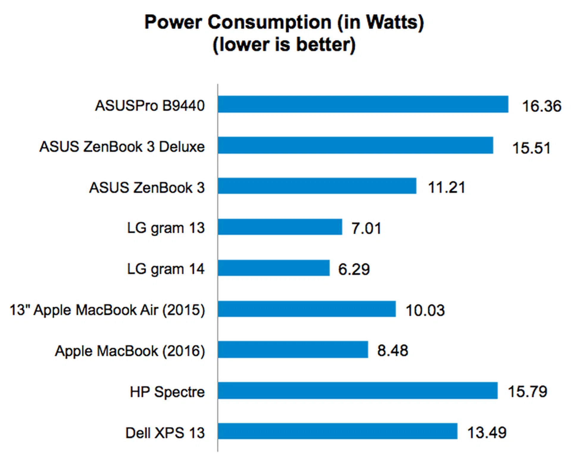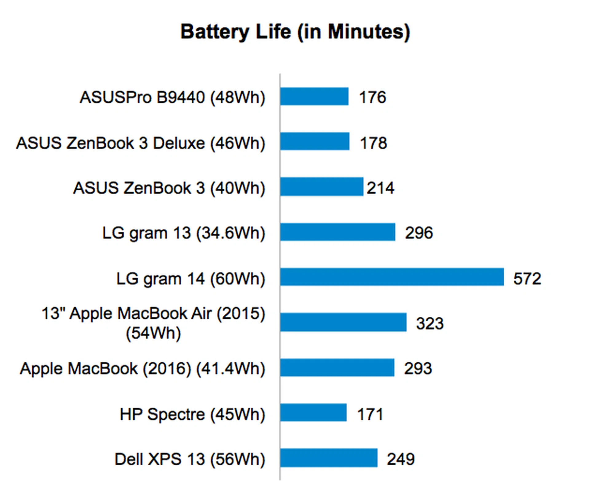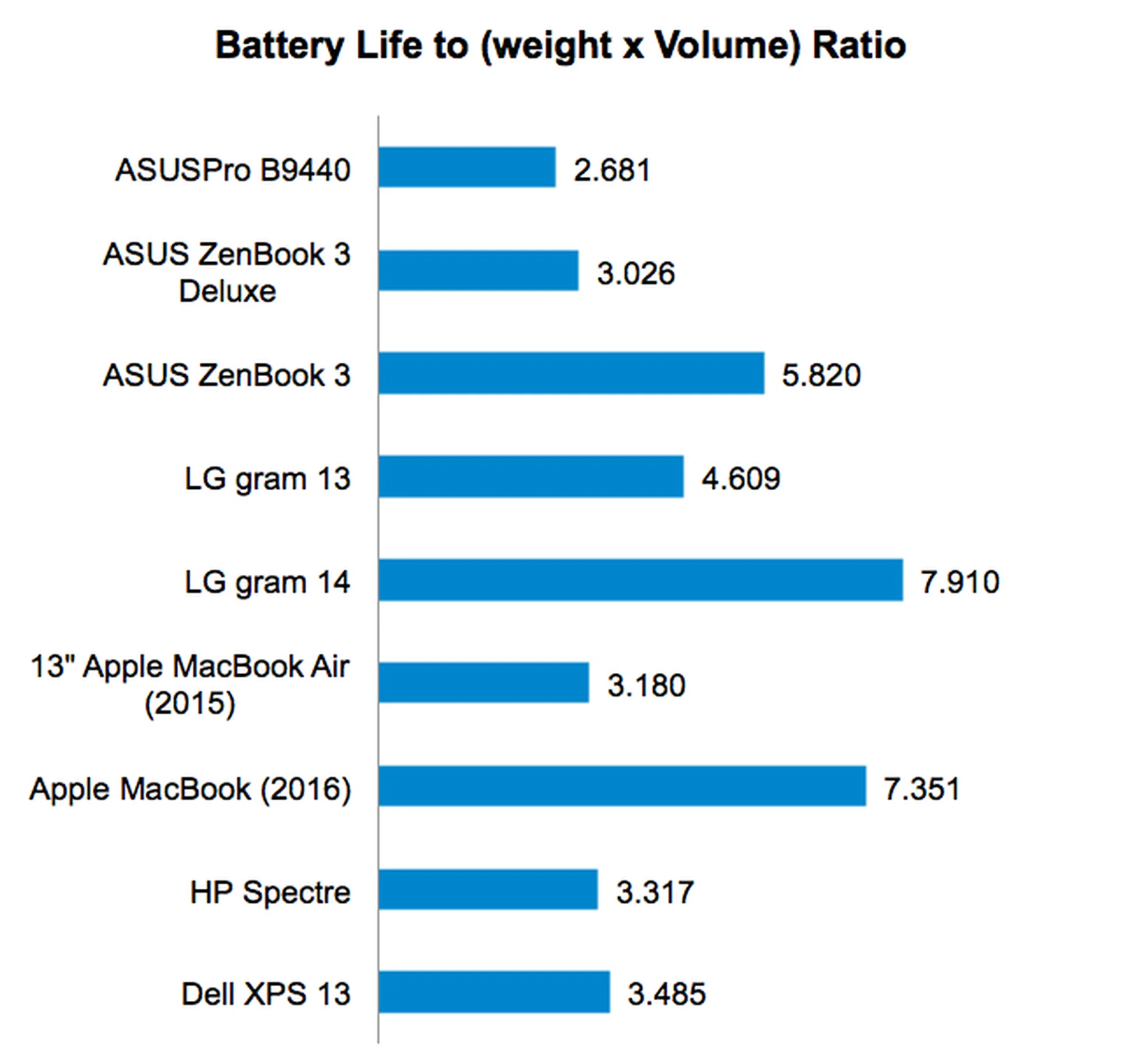 Our Portability Index factors in battery life, weight and volume so you can see which notebook is the most worthwhile to carry around. As a result of its disappointing battery life, the ASUSPRO B9440 did not score as well as one might expect in our Portability Index. Its ratio of 2.681 is actually the lowest even if it is one of the lightest and slimmest notebooks around. If you value battery life as much as portability, the LG gram 14 and Apple MacBook (2016) offers the best combination of portability and battery life.