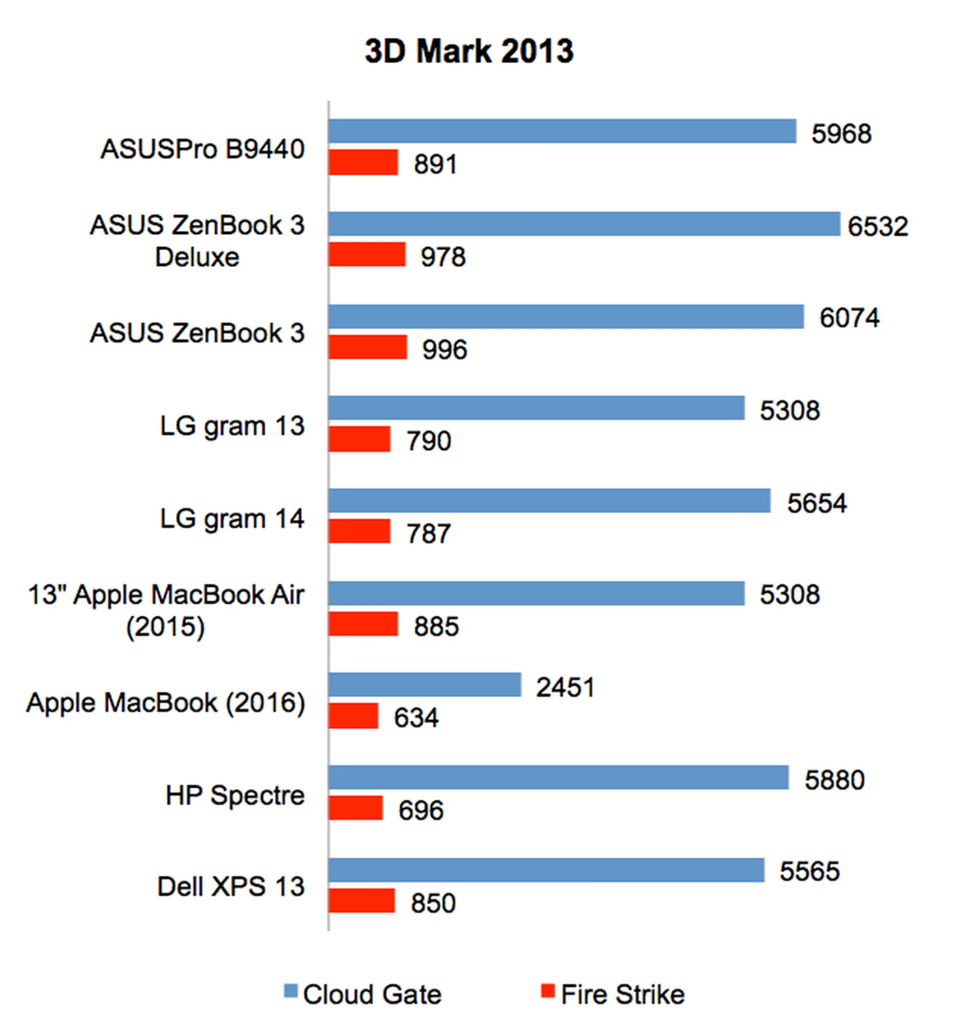 Even though the ASUSPRO B9440 has similar specifications to the ASUS ZenBook 3 Deluxe, its 3DMark scores were noticeably lower. On the less intensive Cloud Gate scenario, it scored 5968 points, which was about 9% less than the ZenBook 3 Deluxe. On the more intensive Fire Strike scenario, it scored 891 points, which was again about 9% less than the ZenBook 3 Deluxe. That said, its overall scores actually puts it amongst one of the better performing notebooks. Most notably, the B9440 scored significantly better than the LG gram 13 and 14, both of which are also powered by the same class of new Intel Kaby Lake processors.
