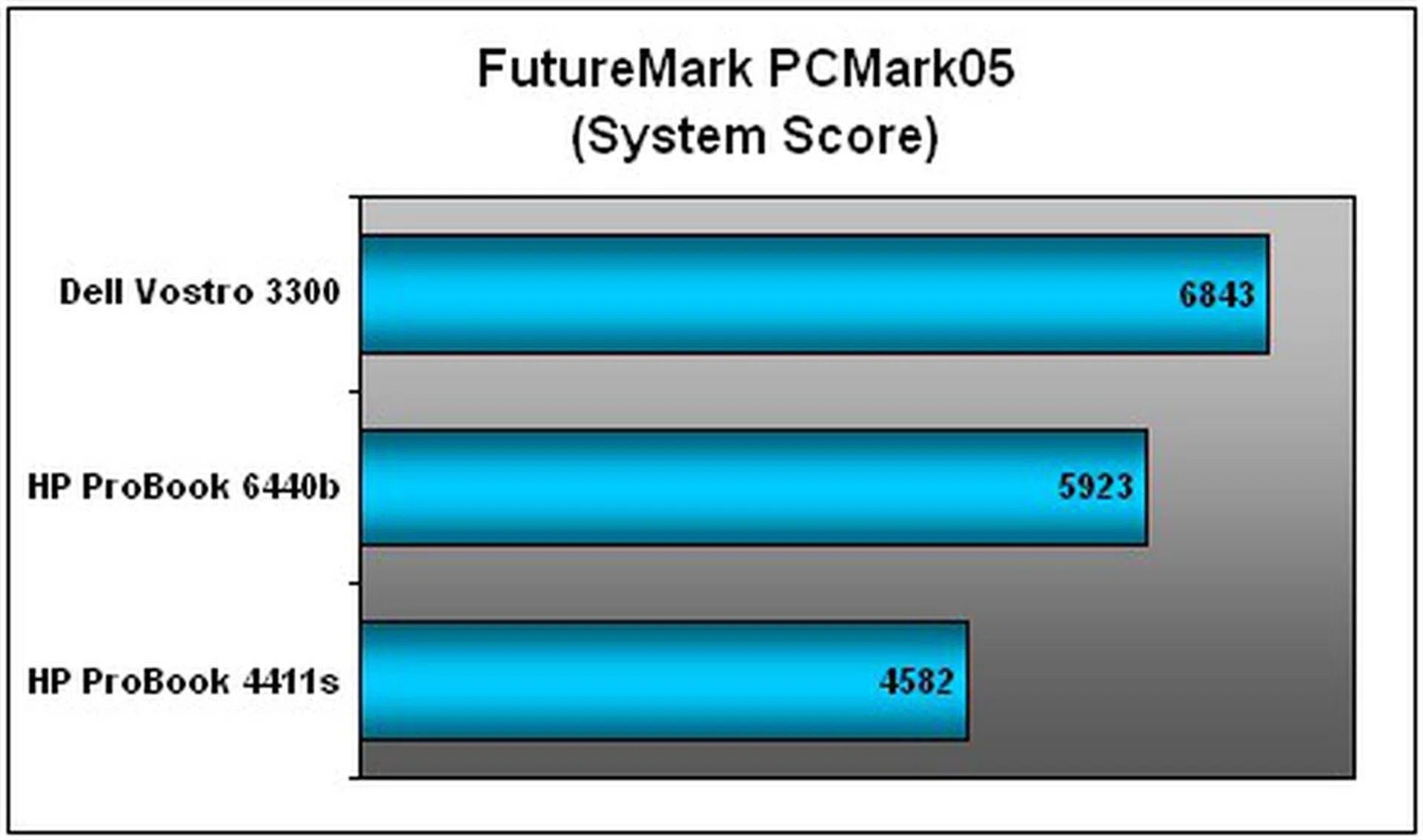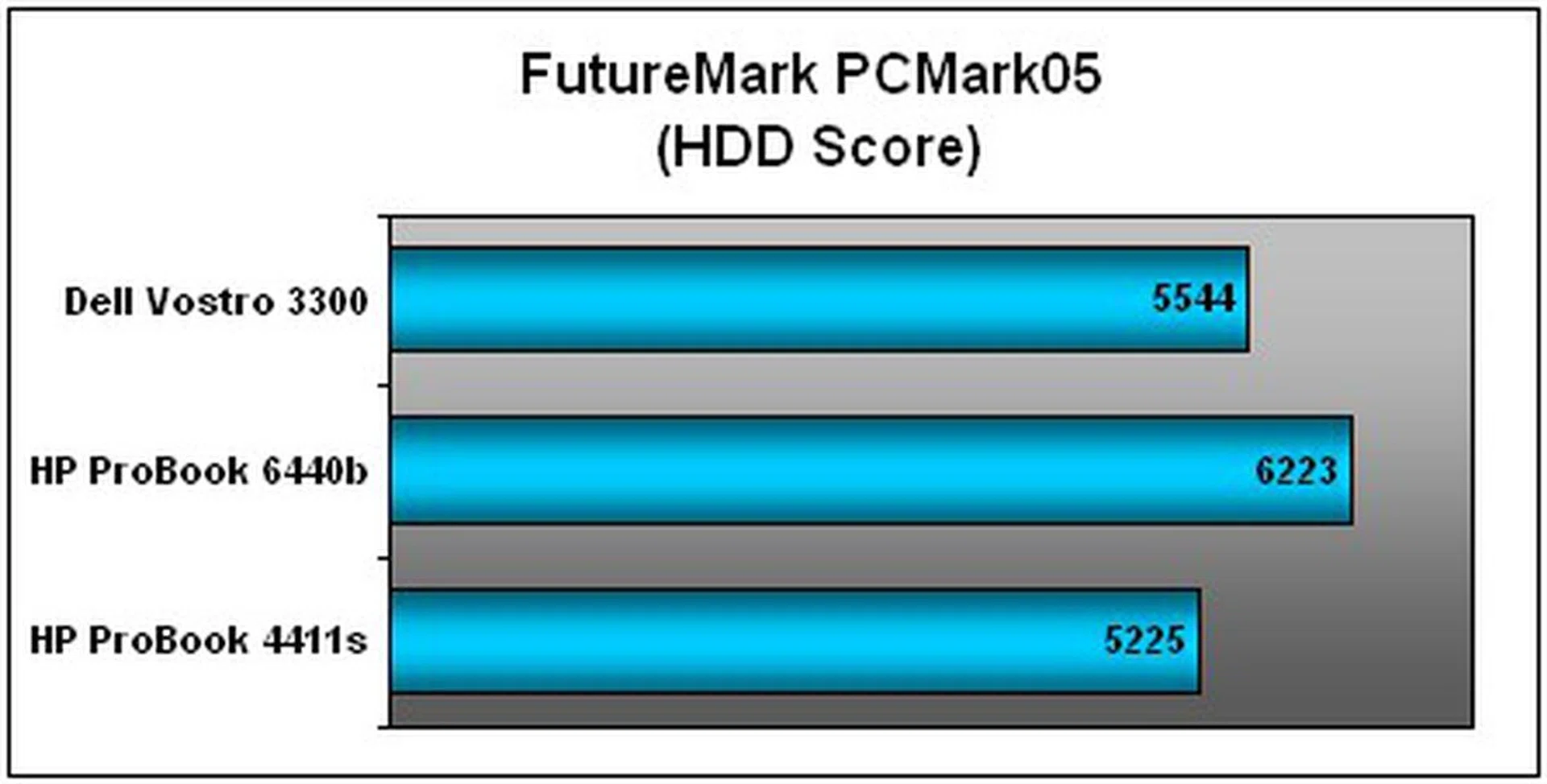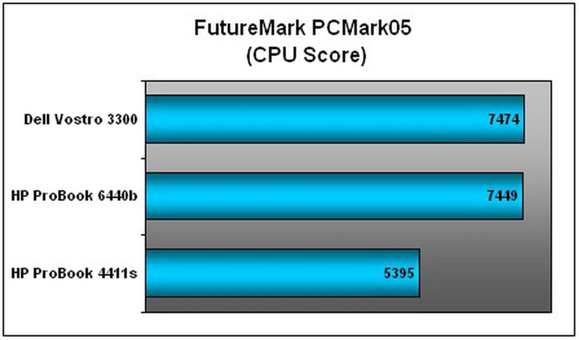 As you can tell from PCMark05's CPU scores below, there was little to tell the two executive notebooks apart given their use of similar processors. Both results hovered in the 7,500 PCMarks range. However, Dell's business offering is arguably the superior candidate given its overall systems score on both benchmarks, thanks to a perkier GPU and greater RAM capacity. The older ProBook 4411s, of course, was almost irrelevant with its slower clock speed.