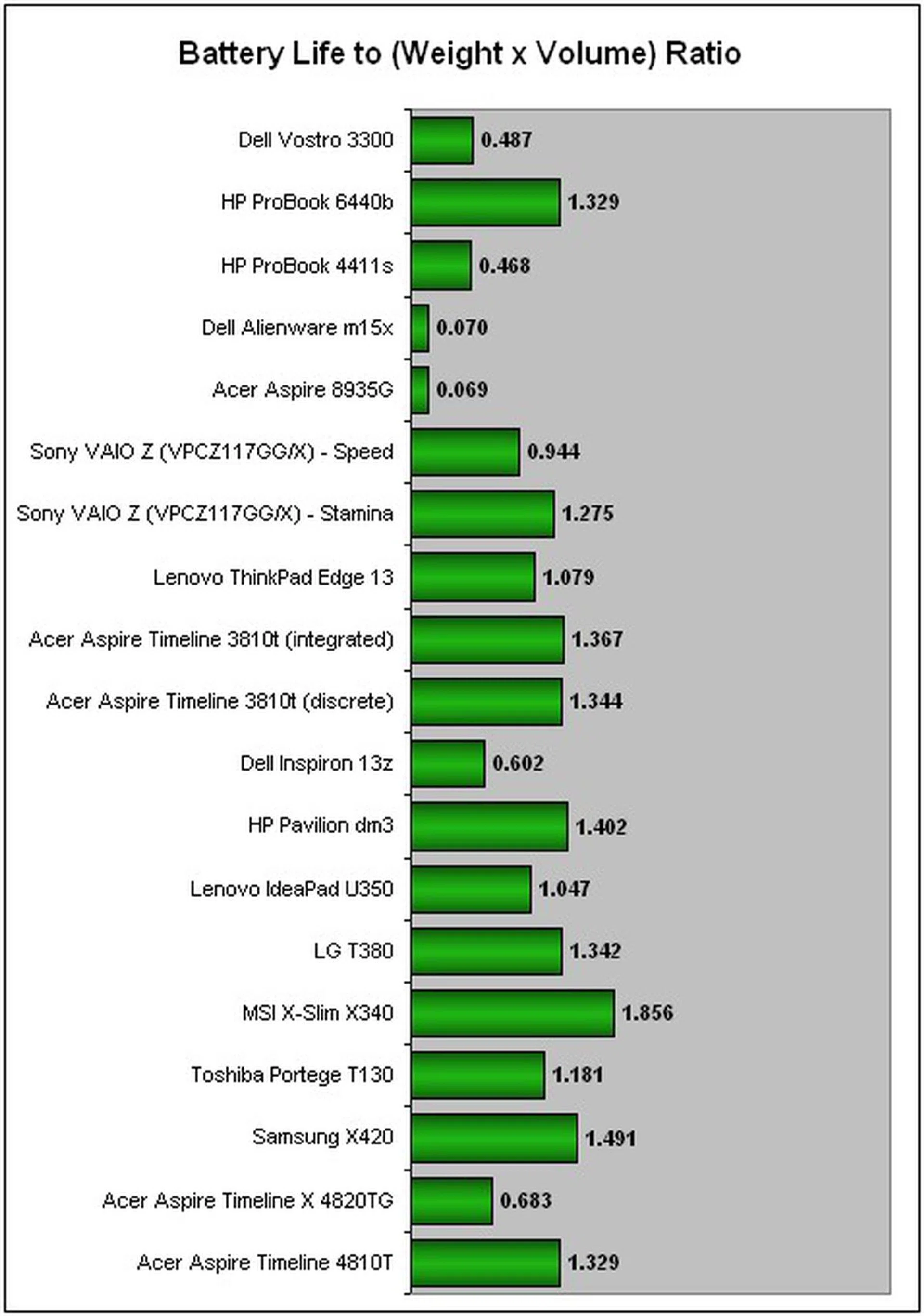 Dell's Vostro 3300 might fall under the ultraportable category, but is it really, hmm, portable? Our Portability Index is based on the battery's uptime divided by the product of the unit's weight and volume. To help you figure out what this mambo-jumbo means, just remember that the higher the ratio, the more portable the unit is. And lastly, the ratios obtained are best compared within the same product class to give more meaningful representation. The HP ProBook ended up with a higher score of 1.329 compared to the Vostro's ratio of 0.487. While Dell's Vostro 3300 may be lighter than HP's by a notch, the Vostro's shorter battery life has marginalized its portability index as a result. Of course, it is also no match for the CULV brethren such as Samsung's X420 and Lenovo's IdeaPad U350 powered by low-voltage processors. What's more, these featherweight entries don't cart an optical drive to begin with which makes them lighter on the whole. On the bright side, the Vostro 3300 is still a tad more portable than the larger 15-inch laptops like the Alienware m15x for example.