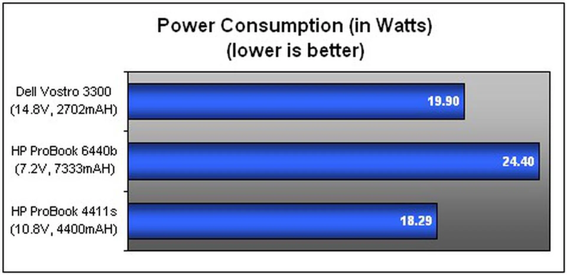 The Vostro managed to last for 121 minutes or slightly over two hours on the gruelling DVD loopback test. That said, your notebook is more or less spent after a two-hour movie run. One bout of Iron Man would do just fine. Work wise, its battery endurance has just enough juice to sustain a comparable period of uptime of two hours or more should you plan to slog on the notebook without that power brick. Say, like a type-fest with word processors or scouring the web for stock updates with WiFi enabled. If you can, we'd recommend going for Dell's 8-cell option for a more sustainable stamina, especially if you are constantly on the move. Well, it is only natural that the ProBook lasted longer by comparison, given its higher capacity battery and use of integrated graphics. One thing we have to remember though, is that while Intel has reduced power drains on its Core i5 series with an improved architecture, the 520M' processor's maximum TDP of 35 watts still leaves much to be desired in terms of battery mileage. If you were to look at Dell's power consumption, on the other hand, the Vostro's setup proved to be more economical in comparison, finishing with a power consumption of 19.90 watts versus the ProBook's higher draw of 24.40 watts. Interestingly, and despite the differential in specs, the older generation HP ProBook 4411s managed a bit better all around.
