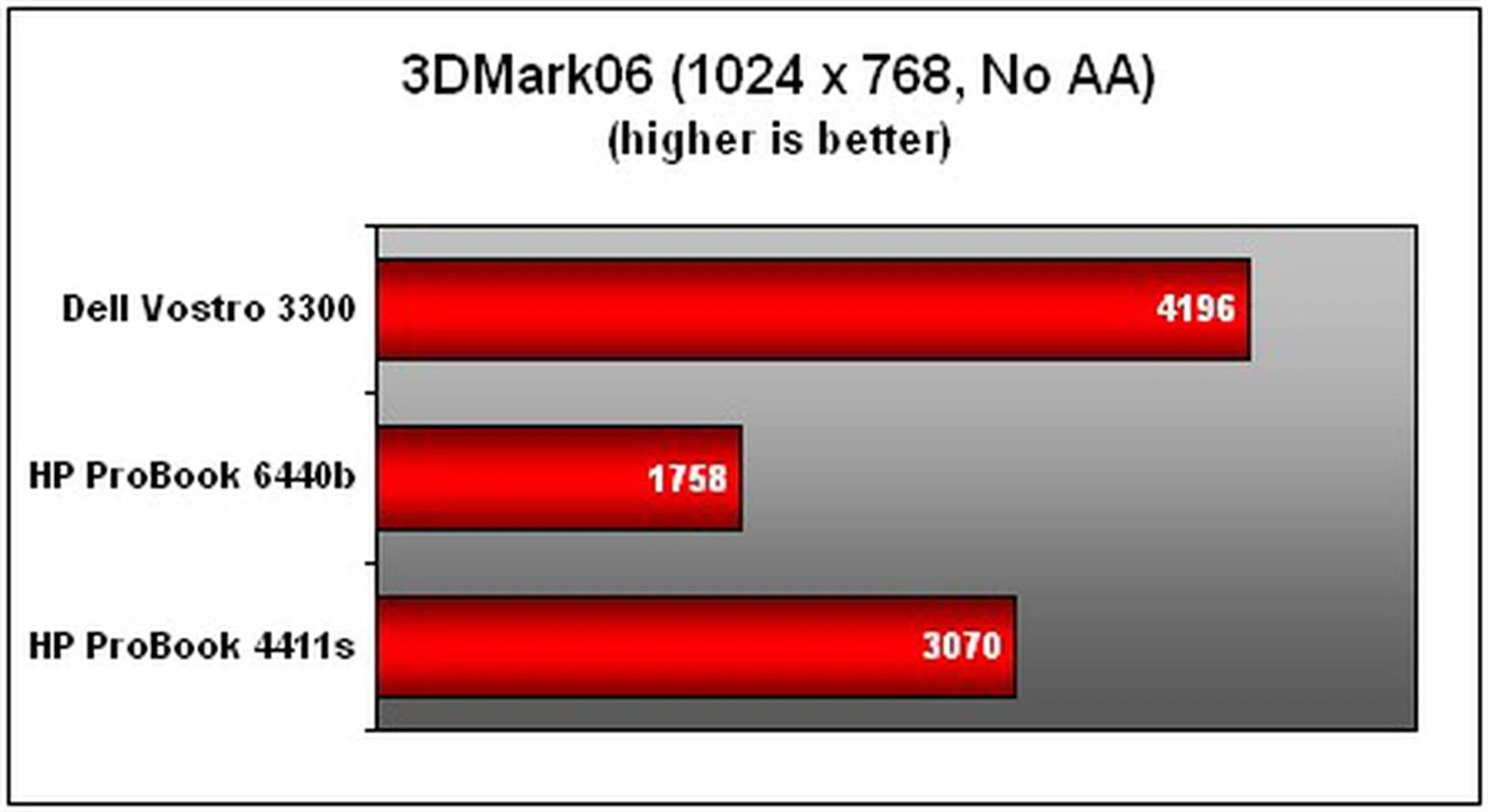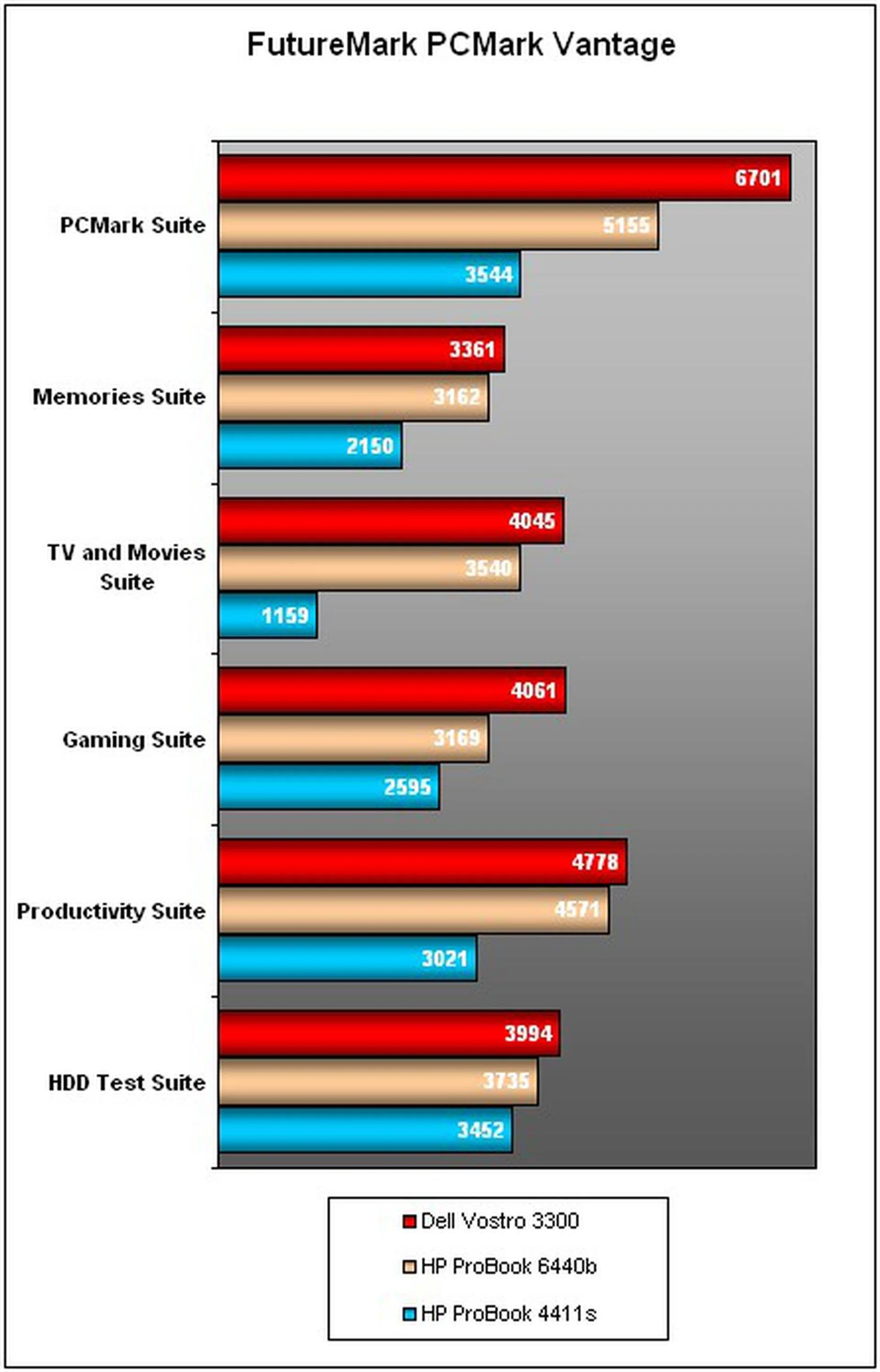 As part of our testing regime, we ran 3DMark06 as well to obtain a whiff on how the notebooks will fare with intensive grapics renders. Yet again, the Vostro has the advantage in the graphics prospect with its use of a discrete GPU. With a built-in memory of 512MB, It's more than capable of undertaking less exhaustive applications such as Flash videos or popular Flash-based games on Facebook, to name a few examples. The ProBook, on the other hand, is dependent on an integrated GMA HD solution and that's on top of a lesser system handicapped by RAM. Being so, it's hardly a surprise that the Vostro managed to trounce its rival with a final 3DMark figure of 4,196, compared to the ProBook's humble result of 1,758 3DMarks. By comparison, and most naturally, the ProBook 4411s' discrete Radeon GPU still fared a whole lot better than Intel's integrated HD package.