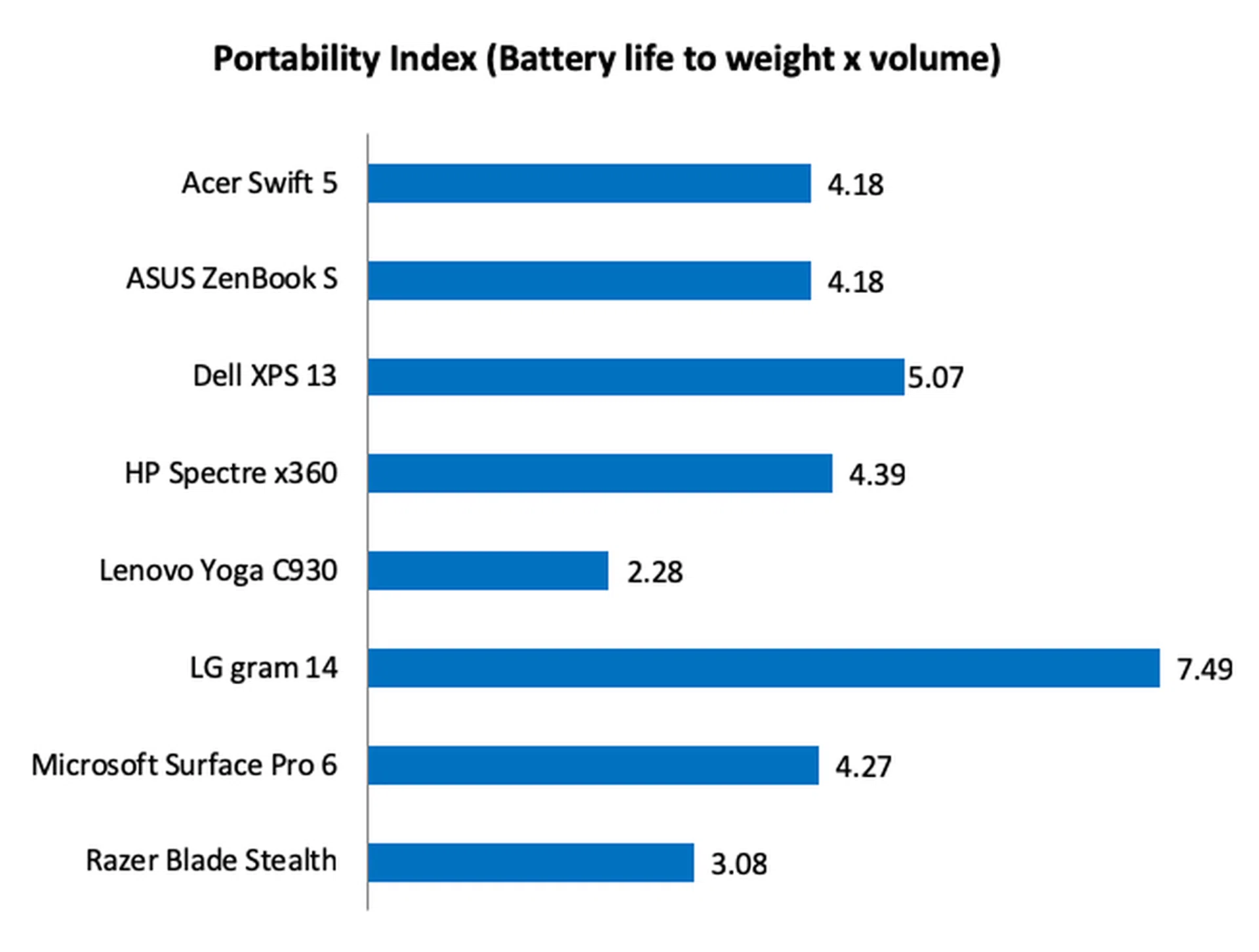 Long-time readers should be familiar with our Portability Index, which is a ratio generated by taking into account a notebook's battery life and its weight and dimensions. The XPS 13 managed a ratio of 5.07, which is, again, second only to the LG gram 14. What’s more interesting is that this is higher than its predecessor’s ratio of 4.86. So in other words, the new XPS 13 is not only more powerful but it is more portable overall because it has a longer battery life.