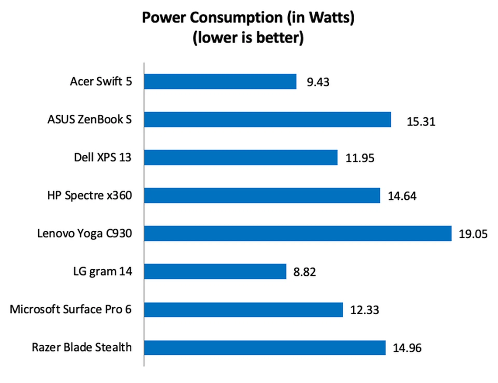 Battery life is great. In absolute terms, it managed the second longest battery life amongst all of the modern ultraportable notebooks that we recently tested. 261 minutes or 4 hours and 21 minutes may be a long way off the LG’s incredible 490 minutes but it is no slouch. And lest we forget, the XPS 13 has a 4K display. Diving deeper, we can see that its power consumption is a fairly low 11.95W. Again, this is impressive because the Yoga C930 - which also has a 4K display - has a much higher power draining rate of 19.05W.