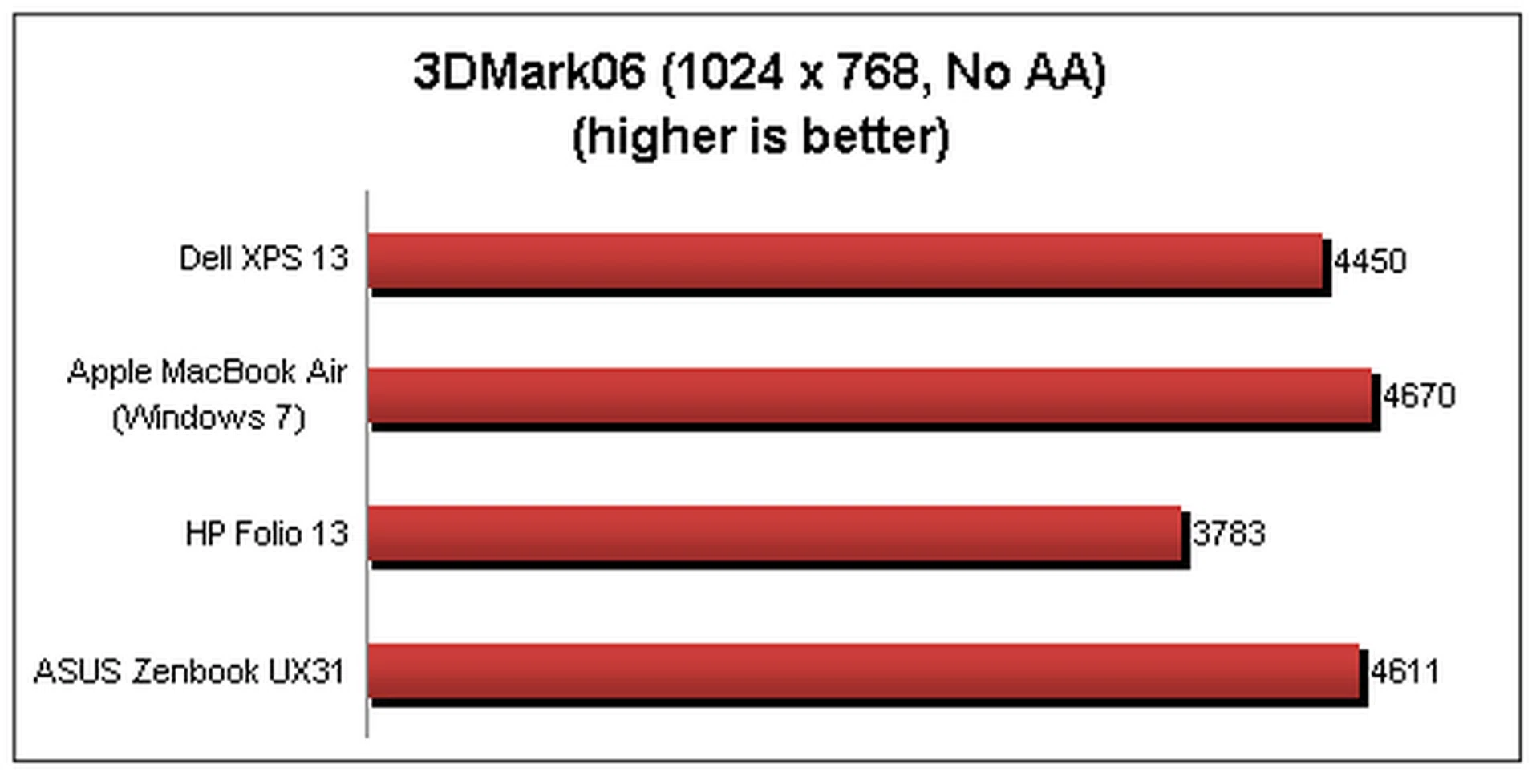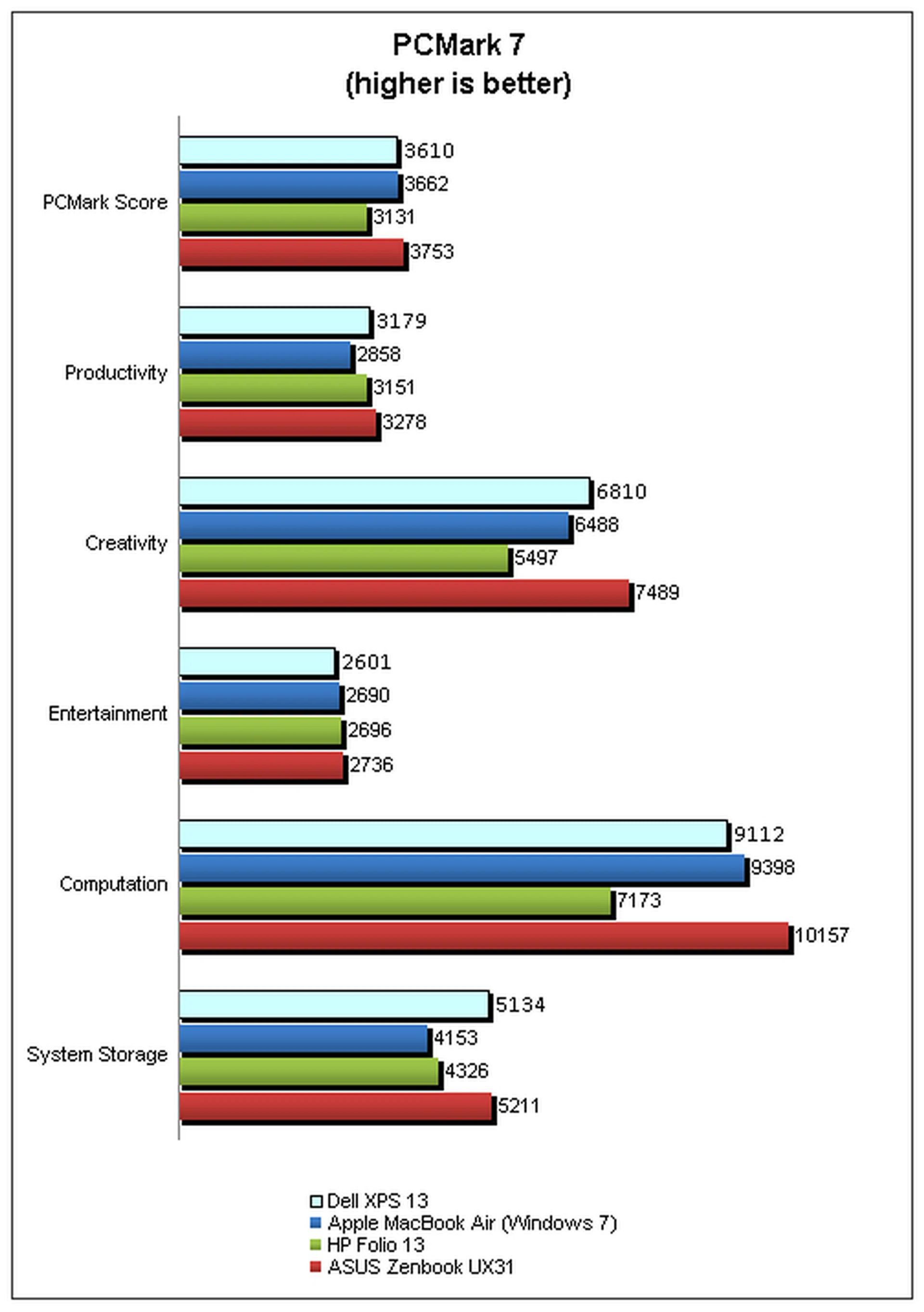 On most suites, the Dell XPS 13 outperformed the HP Folio 13 and was level in performance to the MacBook Air which was helped by its slightly superior processor. The Zenbook UX31 was slightly better across the board thanks to its Core i7 processor (although, we should note, not by enough to justify its price increase).
