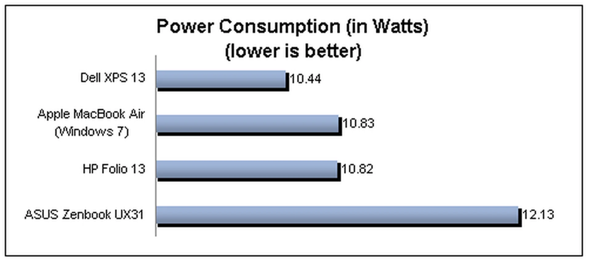 All three Core i5 notebooks have quite low power consumption, with the Dell XPS 13 performing slightly better than both the MBA and the HP Folio 13.