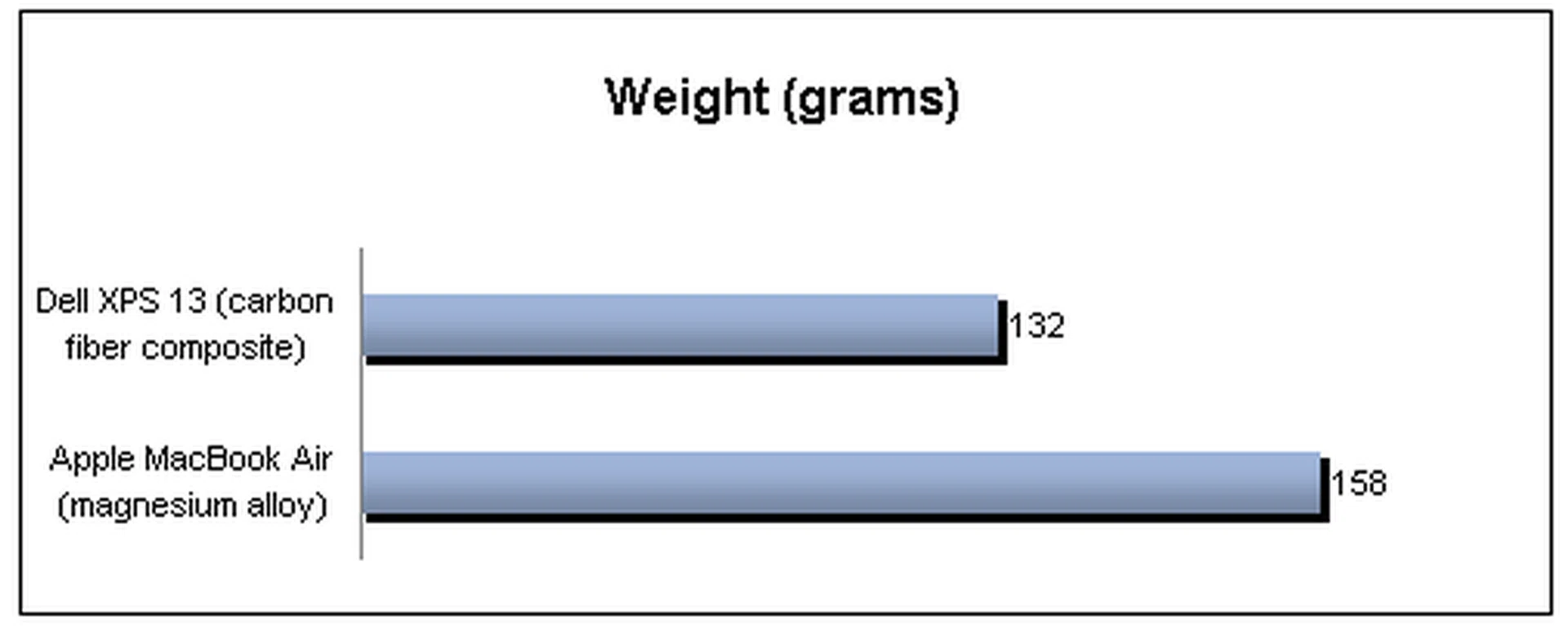 The XPS's carbon fiber base plate weighed 132g, while the magnesium alloy MacBook Air weighed 158g. Not a lot of difference, but again, the XPS 13 is still the winner. We also noted that the XPS 13's base plate dimensions are quite a bit smaller than the MacBook Air's, which could explain the difference in weight.