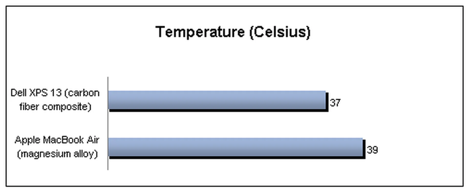 According to Dell, the carbon fiber composite used on the XPS 13 is cooler and lighter than magnesium alloy. To test this, we took a laser temperature reading of the base of the XPS 13 at its hottest point (just under the vent) after running a movie on it for 5 hours, measuring it at 37 degrees celsius. We then did the same to our 13-inch MacBook Air, which registered 39 degrees celsius. Not a significant (or even noticeable) difference, but the XPS 13 was indeed cooler.