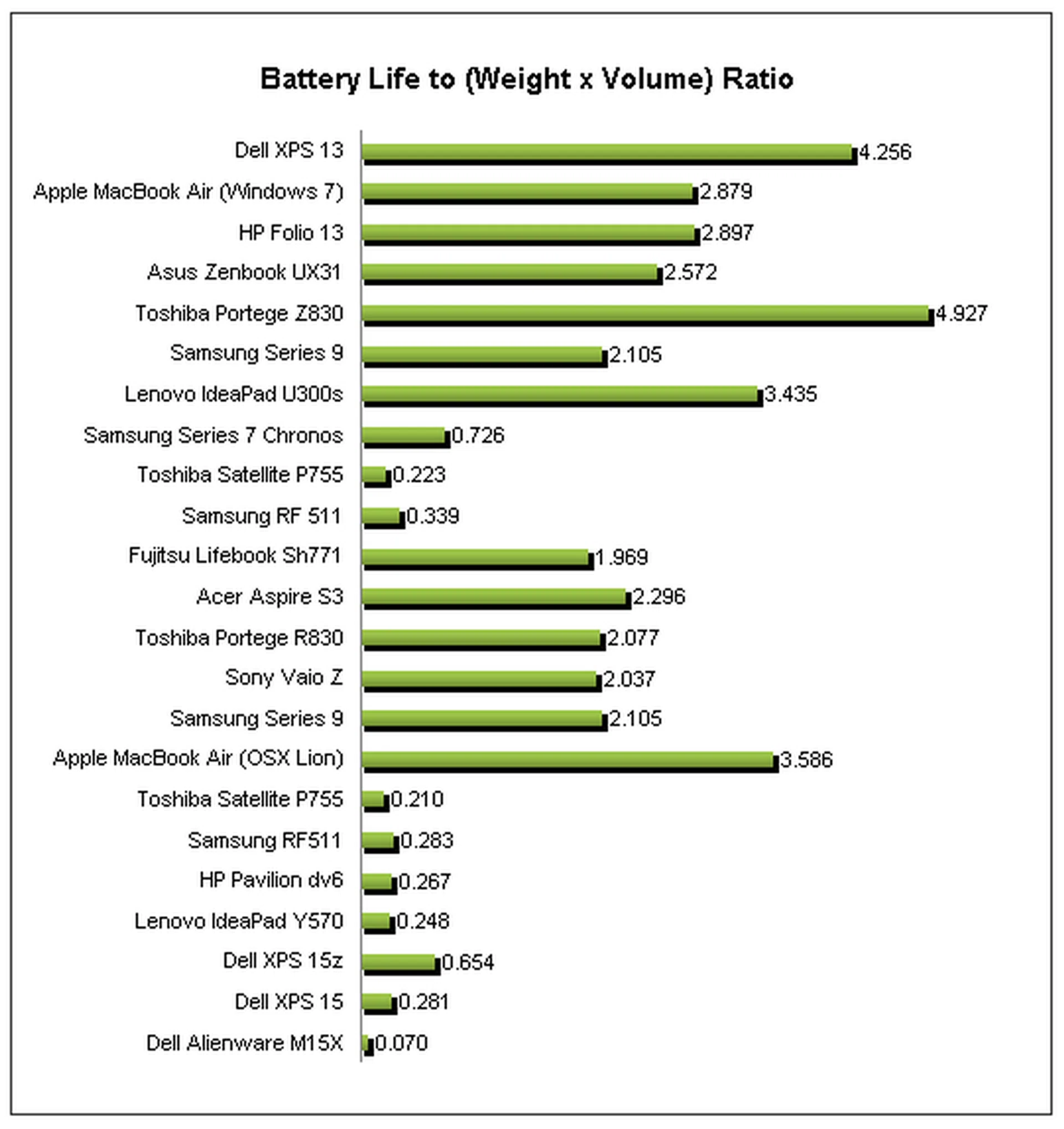 Our Portability Index is a measure of how portable a machine is, determined by its battery life, weight and volume. Or in other words, how likely you are to throw it in your backpack and carry around for the day. Thanks to its small form factor and long battery life, the XPS 13 is one of the most portable machines on our chart, beaten only by the exceptionally lightweight (1.12kg) Toshiba Portege Z830. Considering our history of notebook testing and comparing these scores with relevant notebooks of similar size and class, the Dell XPS 13 is praise-worthy, even if it hasn't matched the Toshiba counterpart. There are very few notebooks that have crossed the 4.0 mark for the Portability Ratio and the XPS 13 has made it into this elite club.