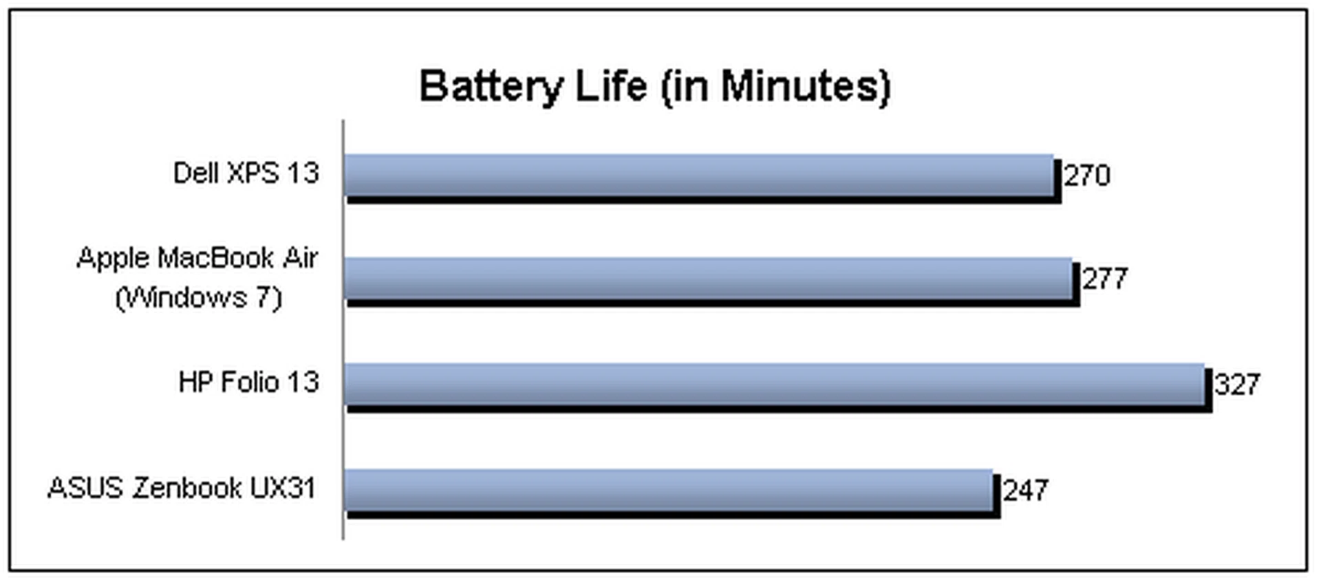 All four machines proved they have the stamina to keep going, lasting over four hours. The Zenbook UX31's more power consuming Core i7 processor saw it die first, while the Dell lasting an impressive 270 minutes or four and a half hours (just enough to let the credits finish rolling on the 263 minute epic Lord of the Rings: Return of the King, Special Extended Edition). The MacBook Air (MBA) was slightly better, but not by a significant amount, with less than 3% extra battery life between them. HP's Folio 13 lasted nearly an hour longer, but the trade-off is the extra 140g of weight from its super-sized battery.