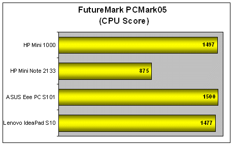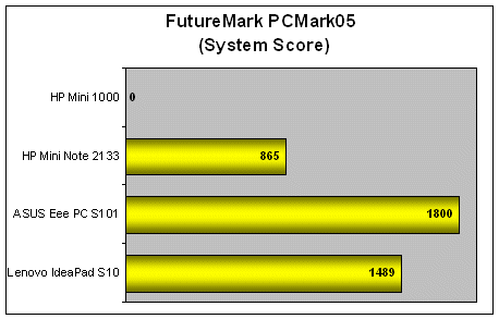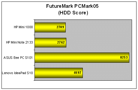 Unfortunately, the Mini 1000 didn't complete our PCMark05 system test due to screen resolution issues similar to the ones we encountered on the MSI Wind. But based on the available results - it's obvious that there's really no difference when it comes to the performance of the CPU. On the other hand, we expected the scores of the HDD test to tank badly and as you can see, the scores of 2709 marks weren't too impressive when compared against the faster 5400RPM drives of the other netbooks.