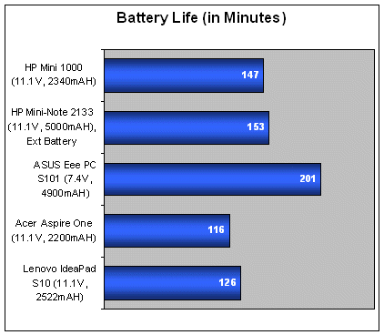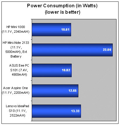We've been harping a lot on the failings of netbooks using 3-cell batteries (especially when 6-cell batteries do the job so much better) over the past few netbook reviews and we aren't cutting the Mini 1000 any slack either. Lasting 147 minutes, the netbook has the best battery life so far among the 3-cell netbooks and 6-cell availability should be coming soon (or so we heard). Lastly, power consumption for the Mini 1000 was the lowest amongst the other 3-cell netbooks, so no complaints there.