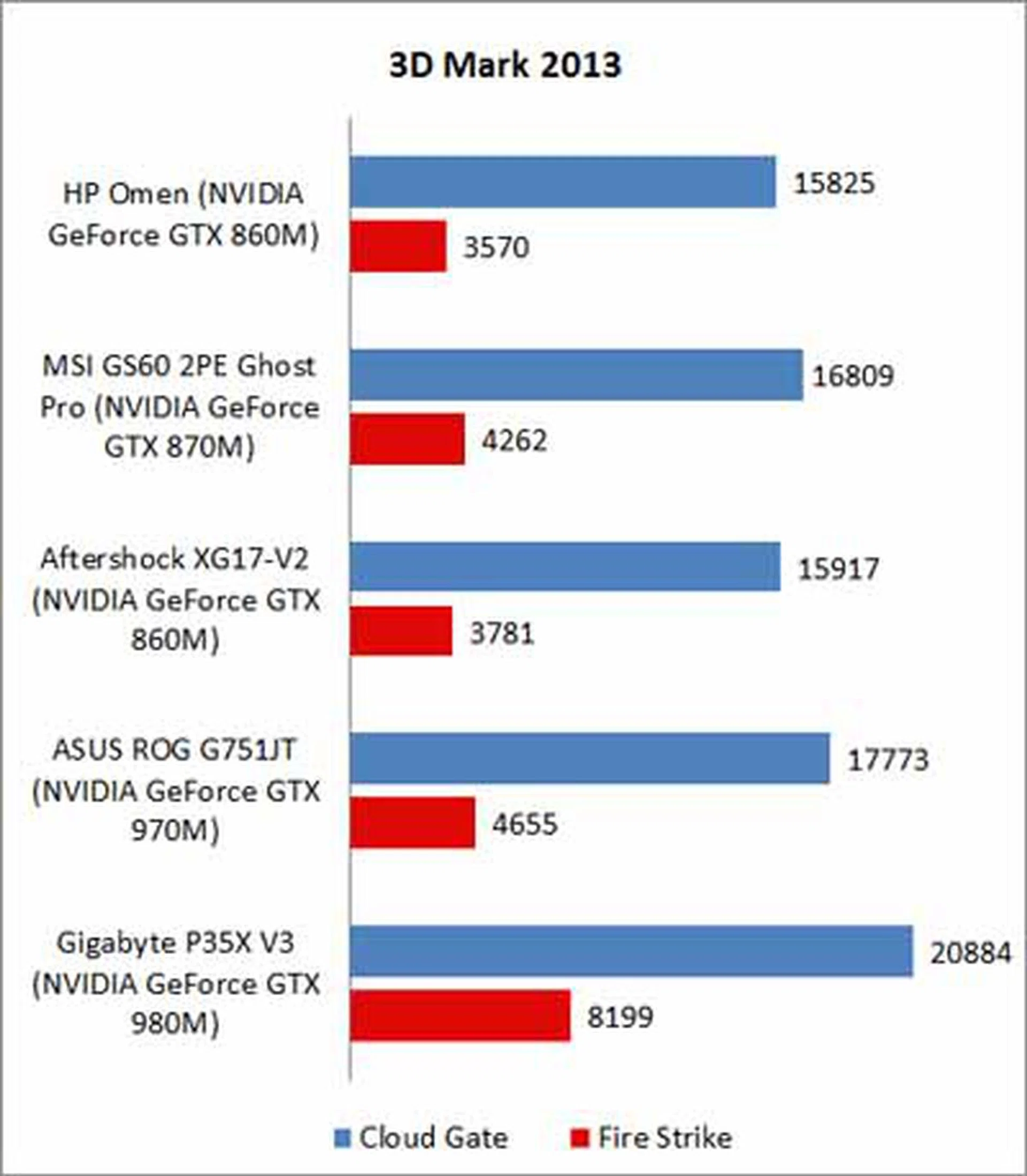 Unlike its initial decent showing in PC Mark 8, the HP Omen's use of an older GPU proved to be its limitation in competing with higher-tier gaming notebooks. It was outperformed by more 12% by the ASUS ROG G751JT, in Cloud Gate. Still, Cloud Gate uses older DirectX routines, which new games no longer use (or use modified versions of it). As such, Fire Strike is a much more accurate presentation of how the HP Omen would perform on today's games.