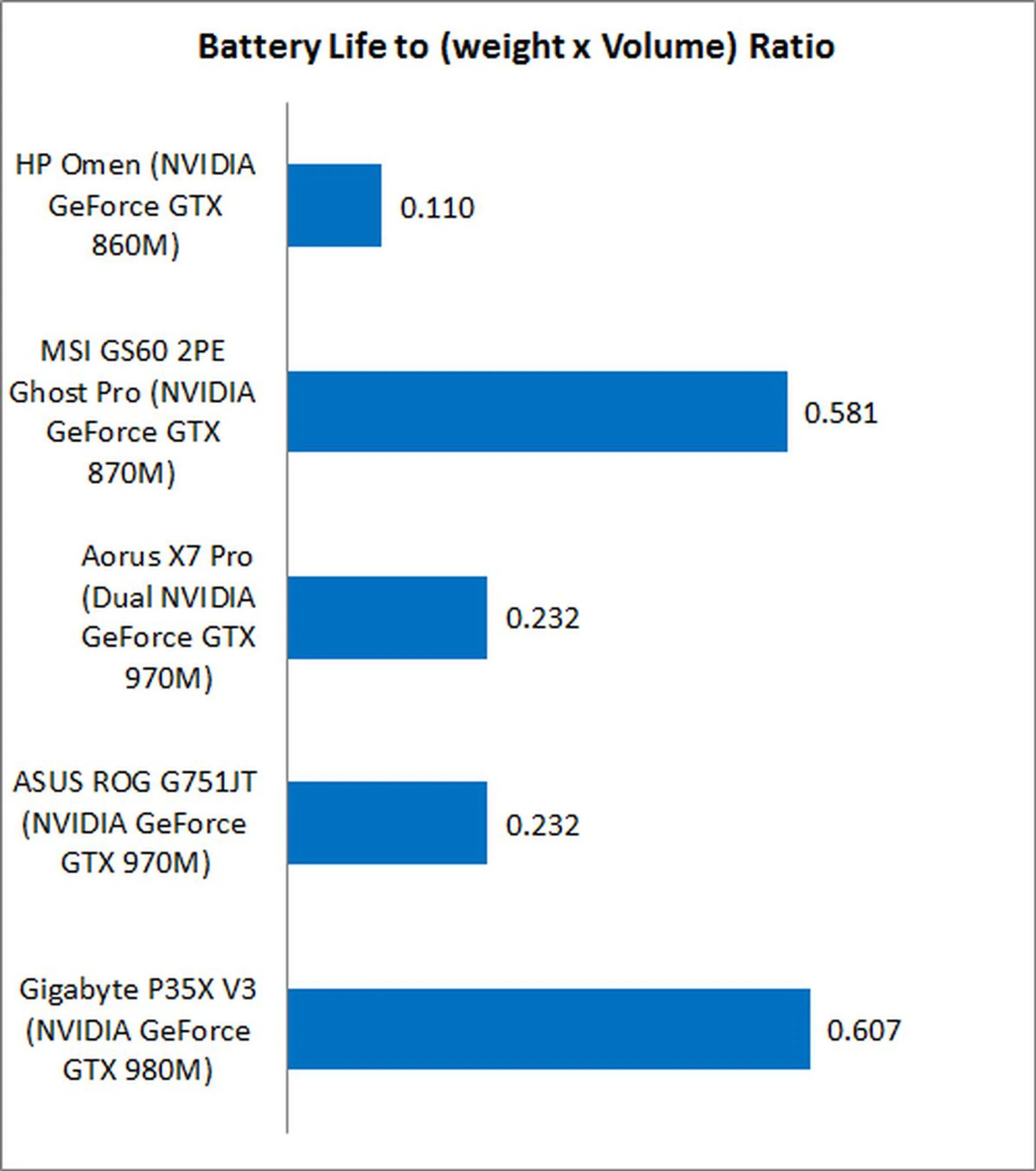 As the HP Omen's battery life is incredibly short, its portability is massively hobbled going by our Portability Index that takes battery life, physical dimensions and weight into consideration. The machine may be one of the lightest (bested in weight only by the MSI GS60 2PE Ghost Pro) but it's also the one with the shortest lifespan and in the end, that means it's just not worth the trade-off if you intend to game in situations where you're not plugged in to the wall.