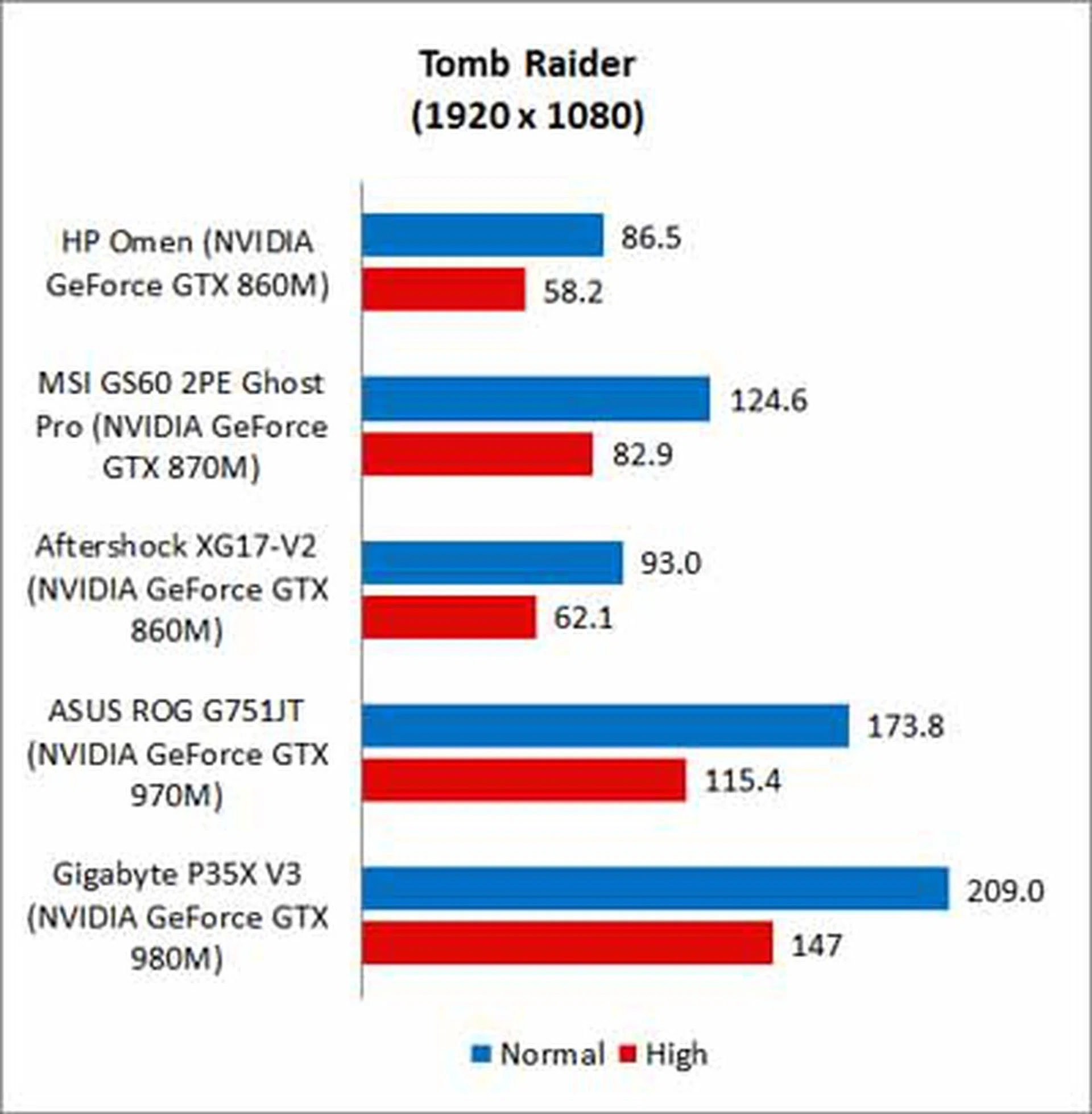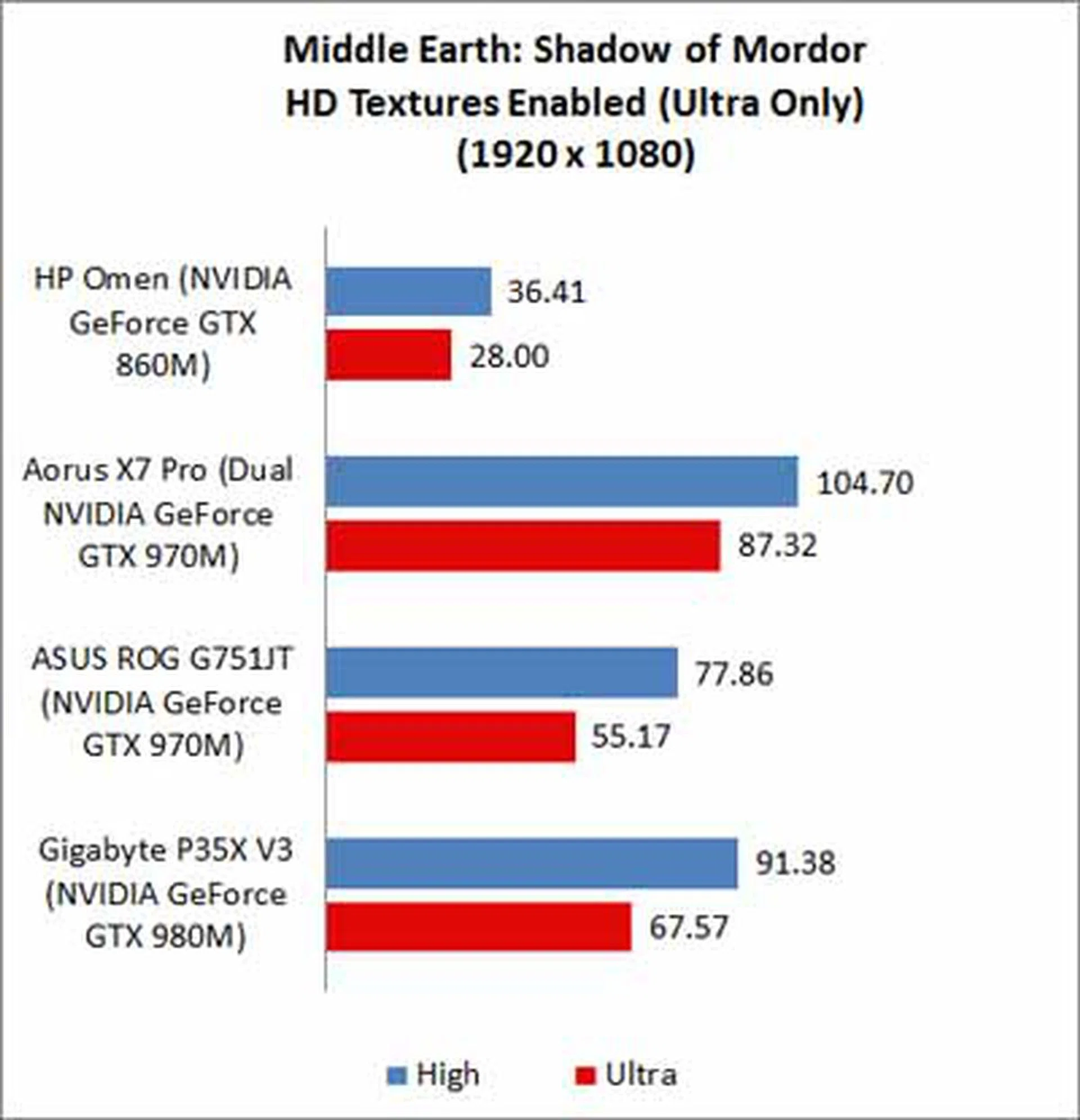Middle Earth: Shadow of Mordor is one of the most demanding games in recent memory. It is so demanding on higher resolutions on Ultra settings, that even SLI machines have trouble getting framerates past 100. Since this is a relatively new gaming benchmark added to our gaming notebook tests, we're unable to show you how the MSI GS60 2PE Ghost Pro and the Aftershock X17-V2 fare as we no longer have these machines in our lab. Going back to the results we can see HP Omen manages 36.4 FPS, which might seem like a letdown, but at least it is above the base playable threshold of 30 FPS.