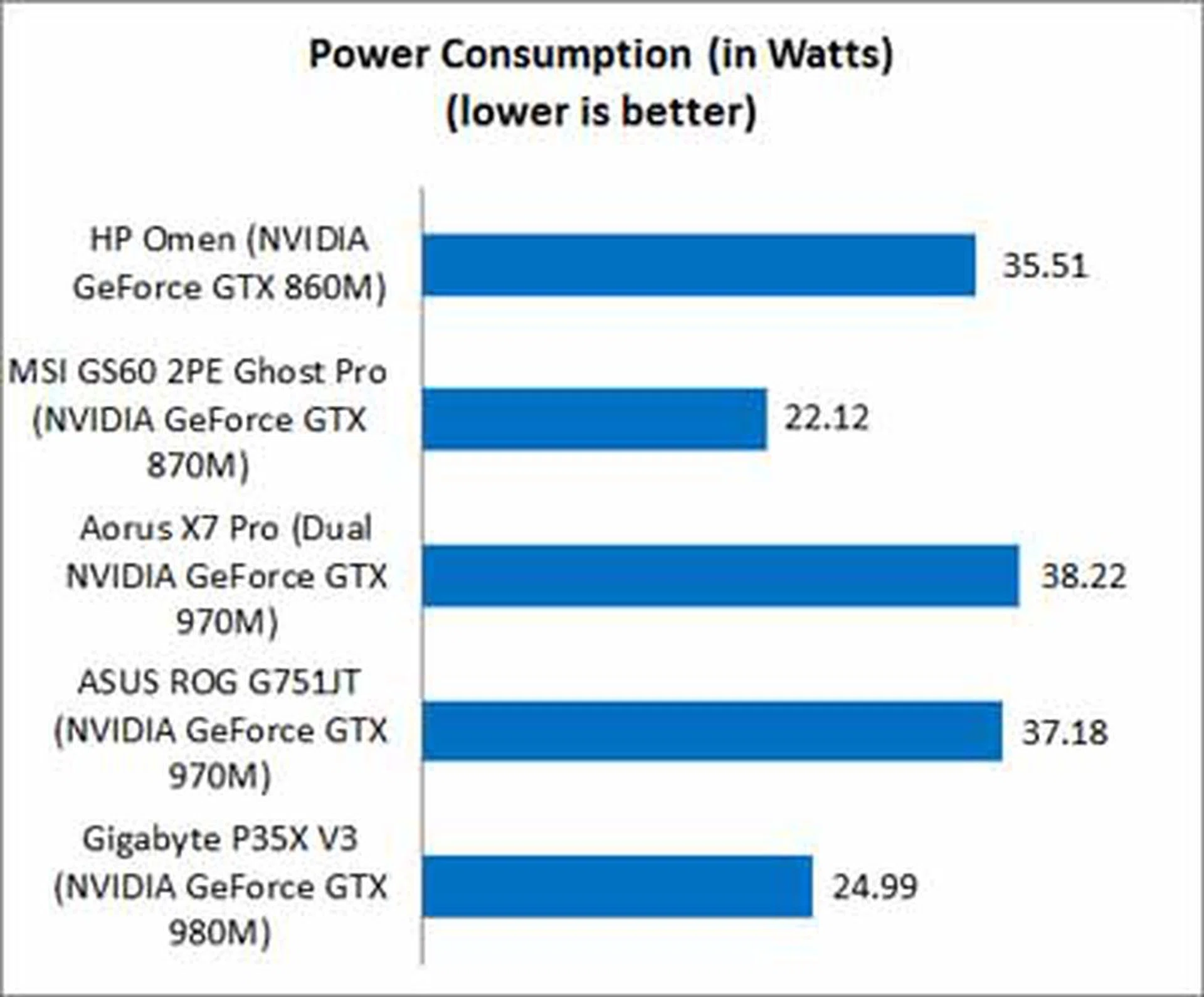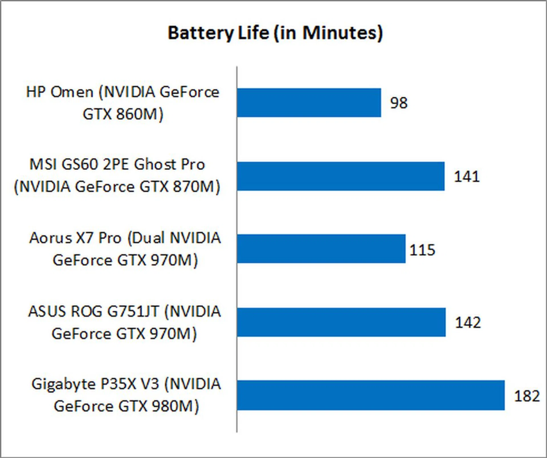 The HP Omen has one of the shortest battery life we've ever seen in recent times and it's not even an SLI machine. It lasted just 98 minutes! Take note that this figure was with NVIDIA's Battery Boost tech enabled. While its low capacity battery (58Wh) might be a culprit, it doesn't quite explain its extra high power consumption as compared to the similarly sized MSI notebook with a better GPU and an even lower battery capacity. Even if you consider the high-end 15.6-inch gaming notebook from Gigabyte with a top-of-the-line GeForce GTX 980M GPU and higher resolution display, it packs a much higher capacity battery, doesn't weigh much more than the HP Omen and manages lower power consumption and lasts twice as long without needing to recharge. Touchscreens are known to consume more power than normal displays and while it compounds HP Omen's longevity issue, it's definitely not the reason for its showing. Clearly HP needs to customize their machine better where power efficiency is concerned.