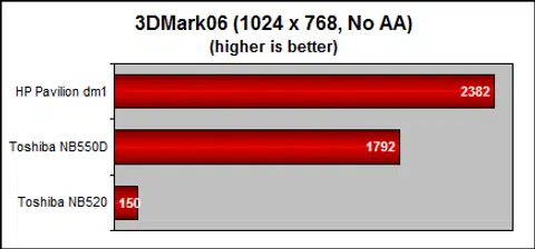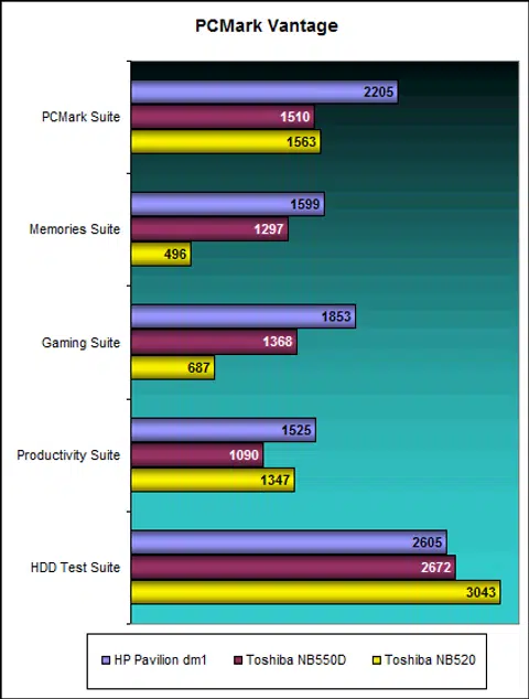 We've rounded up our previously reviewed Toshiba NB550D which uses a similar chipset, and we've already seen between the Intel and AMD platforms. So, with the HP Pavilion dm1 using the more powerful E-350 processor, a larger amount of RAM and twice the TDP draw at 18W compared to the Toshiba NB550D's C-50 and 9W draw, we're expecting to see higher numbers from the HP. The Intel Atom based Toshiba NB520 is added to represent the Intel side of the story.