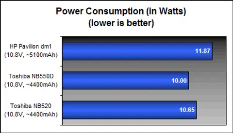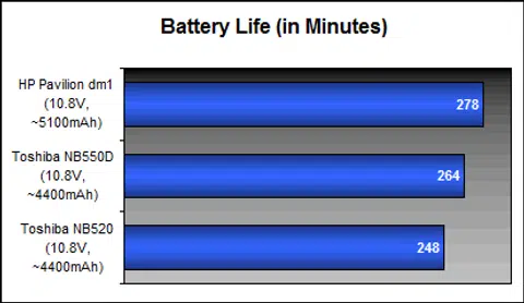 Power consumption figures also show at least twice that of the AMD C-50 processor powered netbook. This is in line with TDP figures, but thanks to that big battery on the dm1, you're still getting pretty decent battery life at 278 minutes (or 4 hours and 38 minutes).