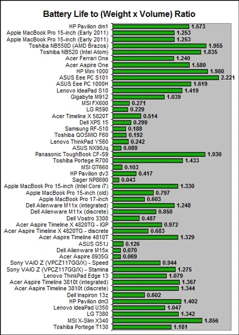 The portability index test is a simple one, and for those who haven't come across our test before, it basically takes the battery uptime of the netbook, which then gets divided by the product of the netbook's weight and volume. What you get is a ratio that shows how portable a device is. While the ratio does give a good indication of a notebook's portability, sometimes common sense must be in place to interpret the results. A heavy battery with good battery life may give you a notebook with a high score, but you might not want to carry the notebook around too much. Similarly, a lighter notebook with a weaker battery life (but still decent enough) may post a high score, but the battery life may not be enough.