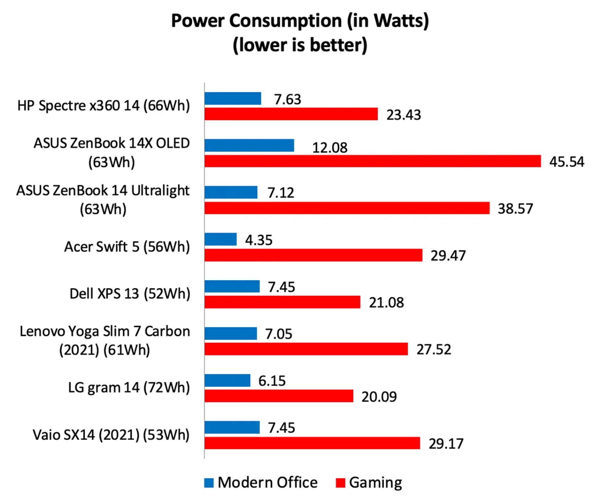 Battery life was quite impressive, which is to be expected given that its 66Wh battery is one of the largest in its class. In our Modern Office test, which consists of a mix of workloads like emails, editing documents and spreadsheets, and video conferencing, it lasted 8 hours and 39 minutes – that’s one of the longest in its class. And bearing in mind that we are doing it with the display at maximum brightness, it’s completely reasonable to think that it will last over 10 hours at more typical brightness settings. Even on the more intensive Gaming workload, it lasted close to 3 hours which is quite impressive. Power consumption figures are within expectations for a notebook with its type of display and specifications.